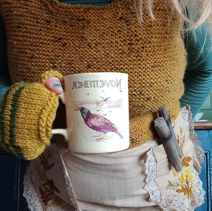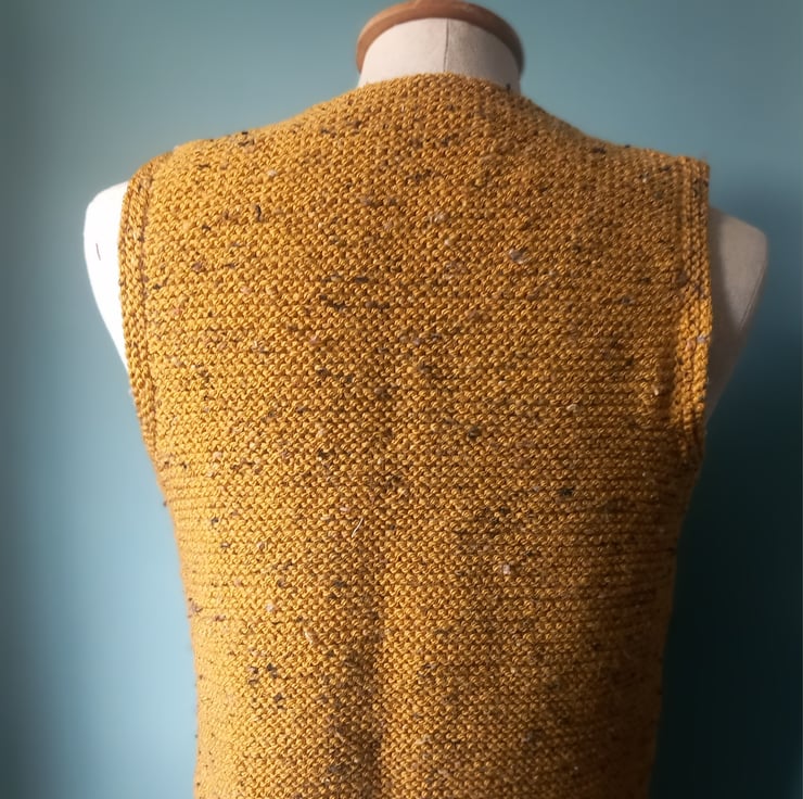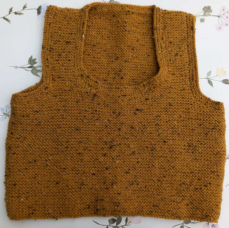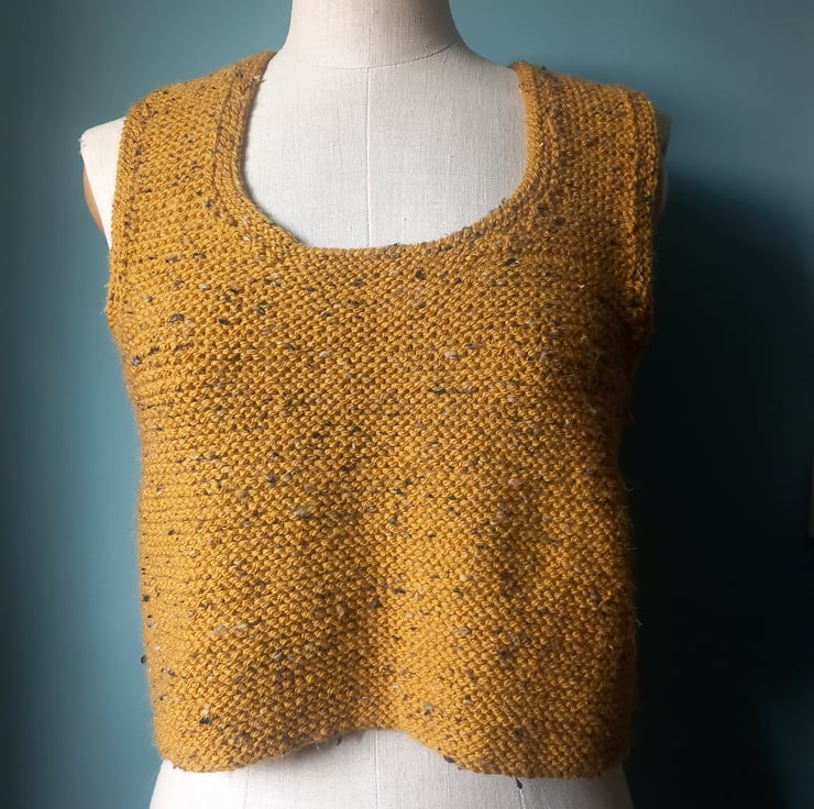 This autumnal tank top is a boxie shape, very cute perfeck for sunny autumn days. Hand knitted by my lovely mum in Rutland. Wool with some acrylic so it will keep it's shape. A comfortable size 10 or a nice snug 12.