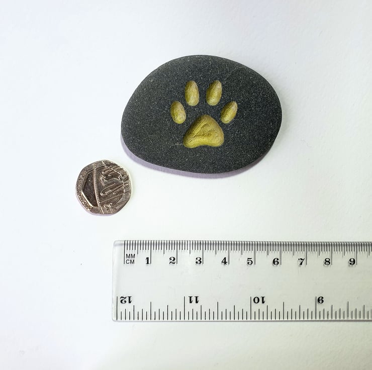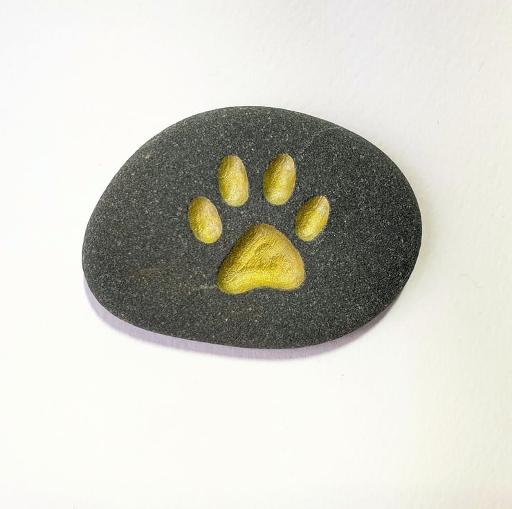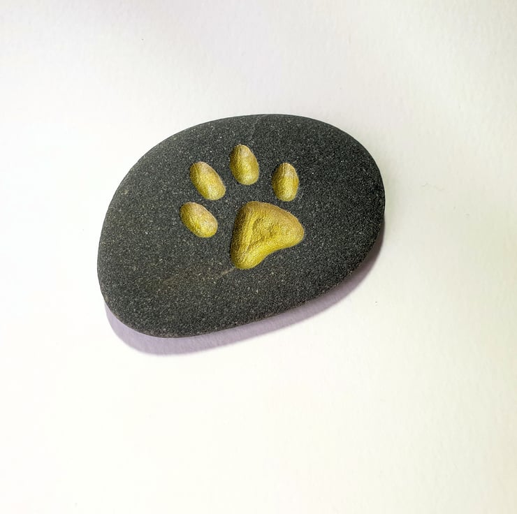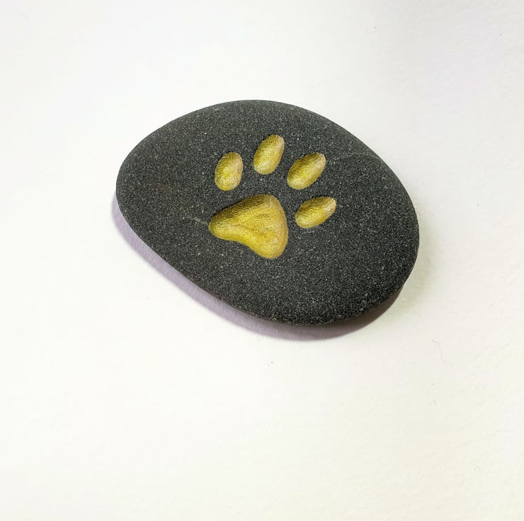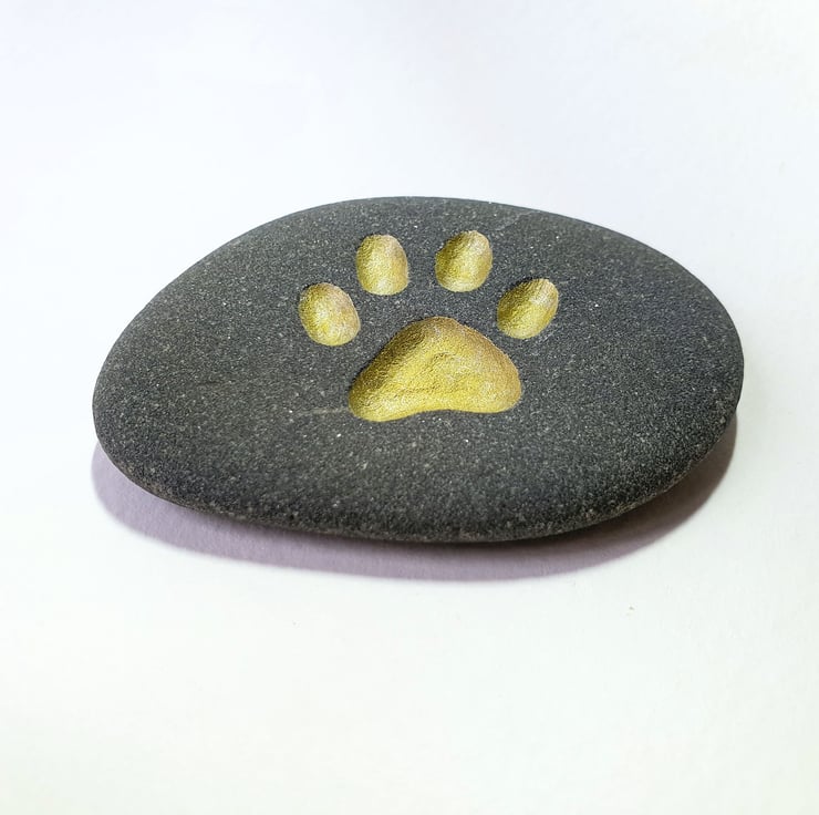 A grey, biege, sandy or light rose coloured stone, deeply engraved with a pets paw. This thoughtful gift could be used as a grave marker, paper weight, book end or an ornament for a desk, window cill or mantelpiece and given for a birthday, wedding anniversary, engagement gift, Christmas present, Mother's day or placed in a garden to remind you. It is a lovely size to fit in the palm of your hand and carry with you as a reminder of your much loved friend, particularly when out for walks.