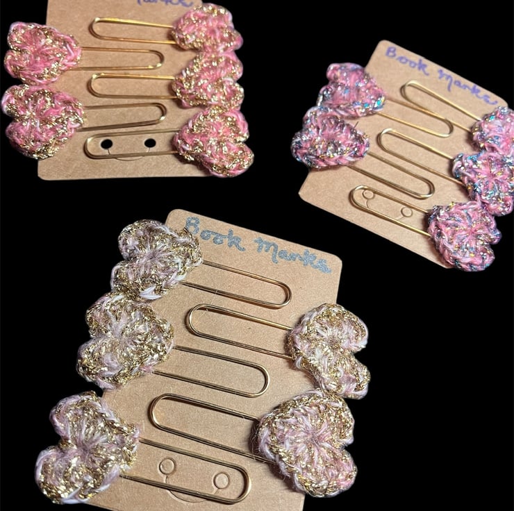 3 sets of paperclip bookmarks. Each set has 5 individual heart bookmarks created by crochet hearts from acrylic and polymer yarn on gold coloured paperclips.