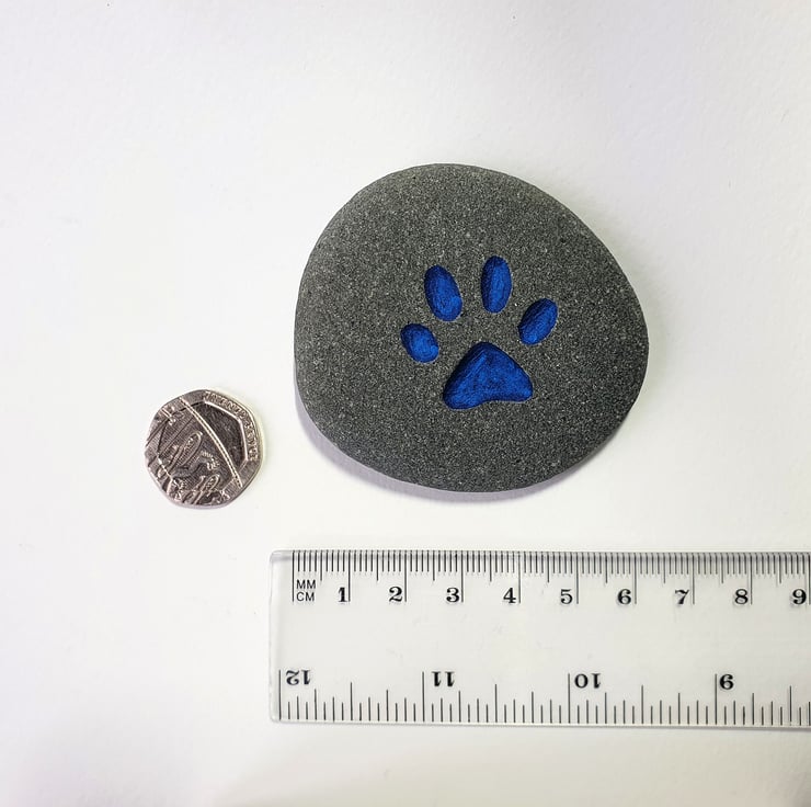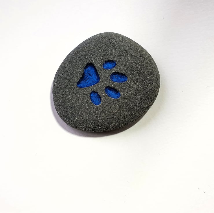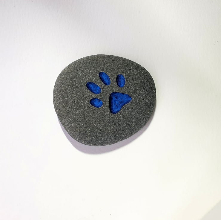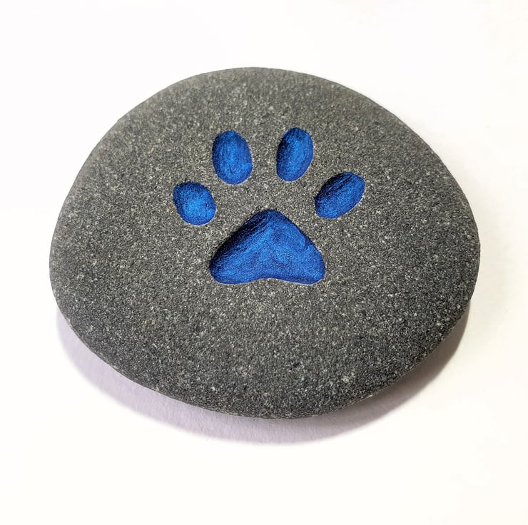 A grey, biege, sandy or light rose coloured stone, deeply engraved with a pets paw. This thoughtful gift could be used as a grave marker, paper weight, book end or an ornament for a desk, window cill or mantelpiece and given for a birthday, wedding anniversary, engagement gift, Christmas present, Mother's day or placed in a garden to remind you. It is a lovely size to fit in the palm of your hand and carry with you as a reminder of your much loved friend, particularly when out for walks.