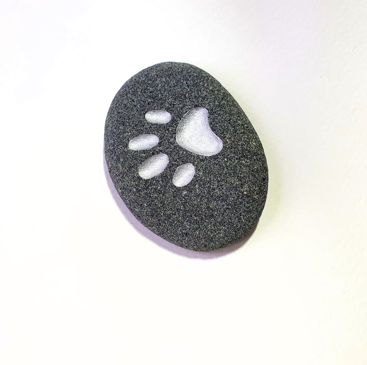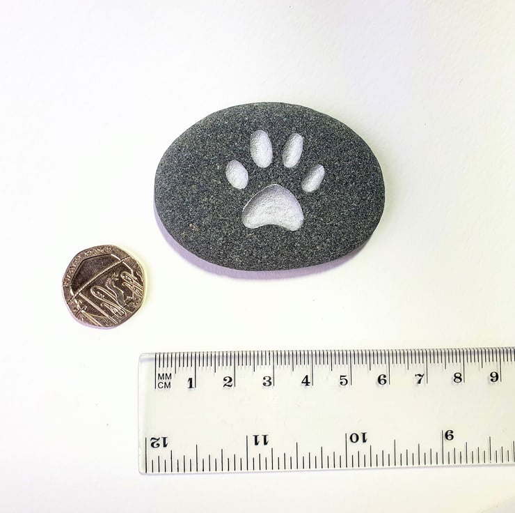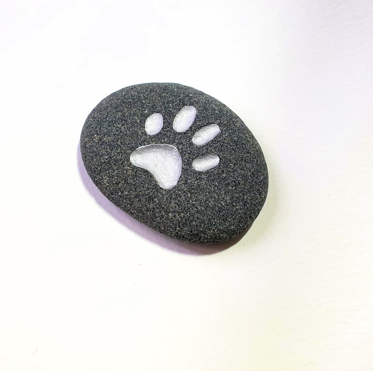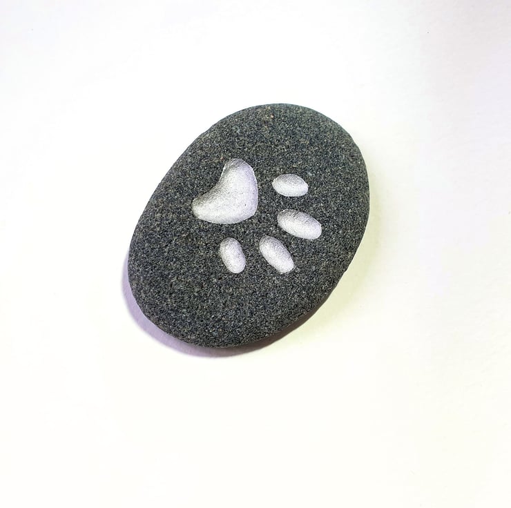 A grey, biege, sandy or light rose coloured stone, deeply engraved with a pets paw. This thoughtful gift could be used as a grave marker, paper weight, book end or an ornament for a desk, window cill or mantelpiece and given for a birthday, wedding anniversary, engagement gift, Christmas present, Mother's day or placed in a garden to remind you. It is a lovely size to fit in the palm of your hand and carry with you as a reminder of your much loved friend, particularly when out for walks.