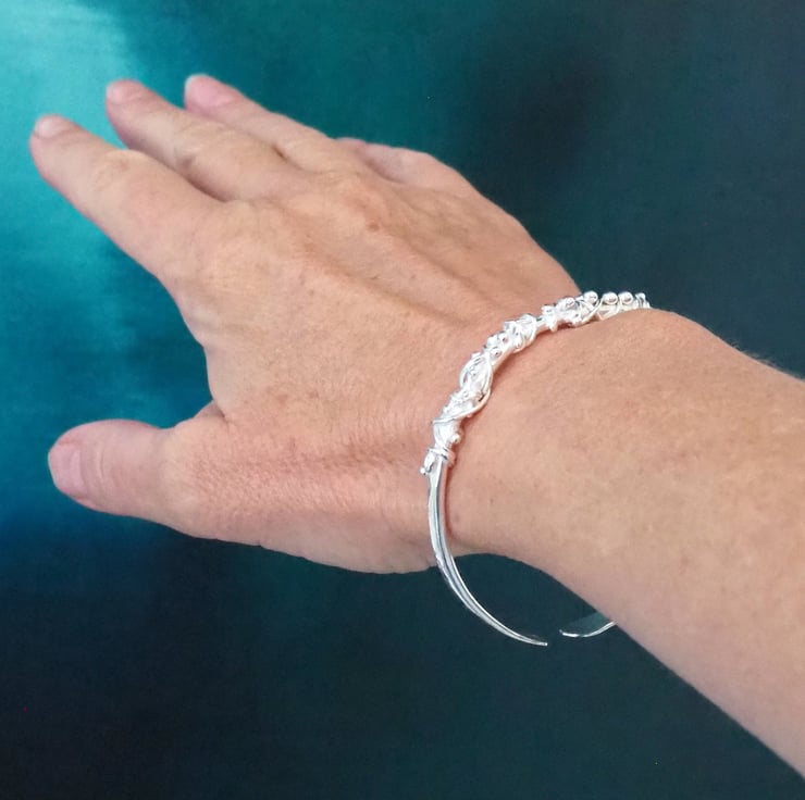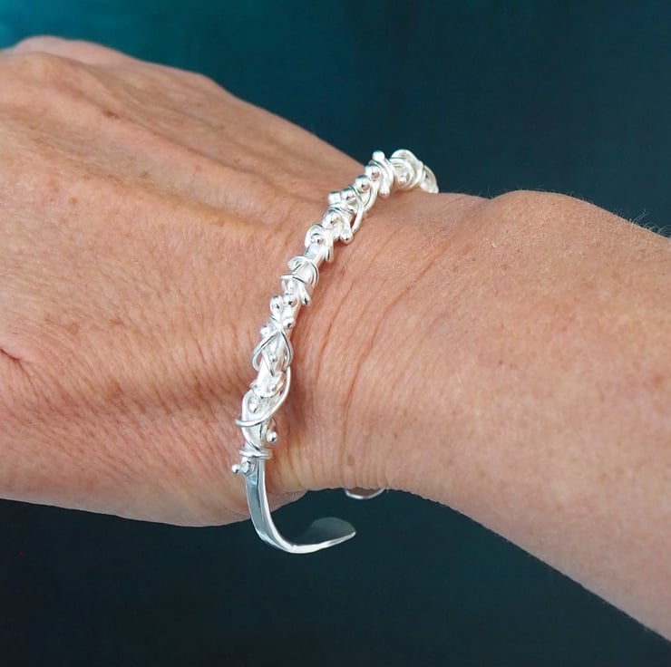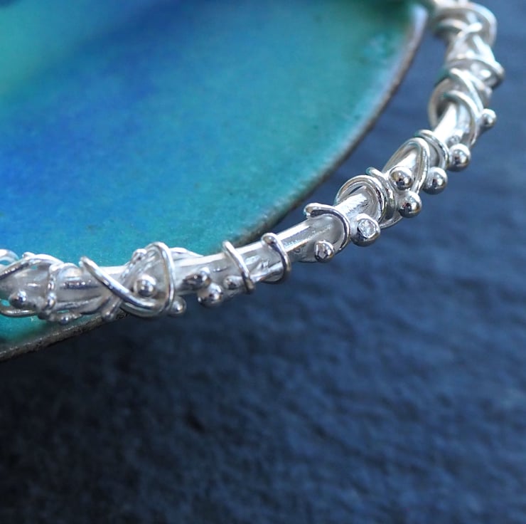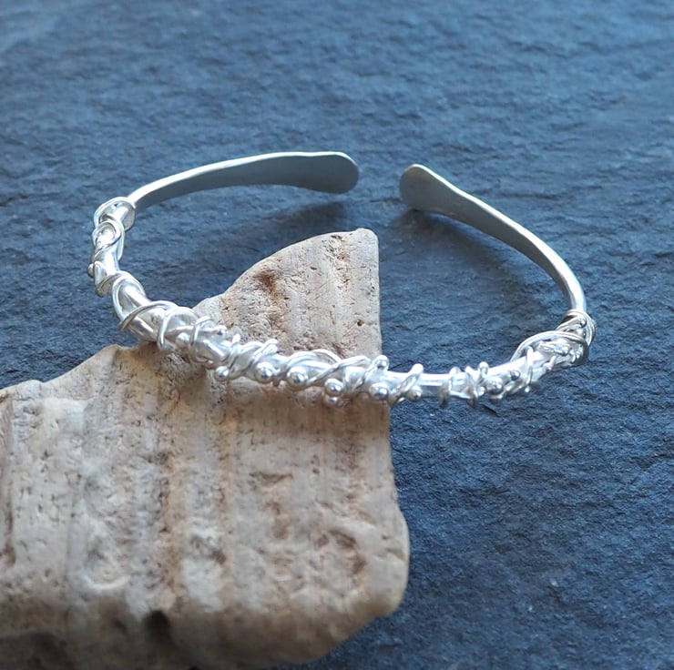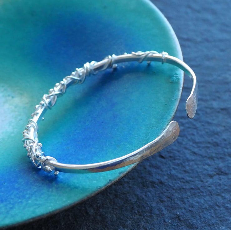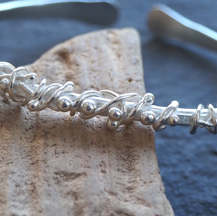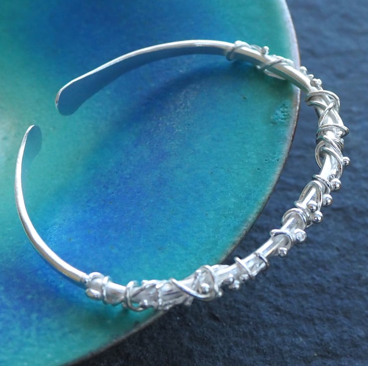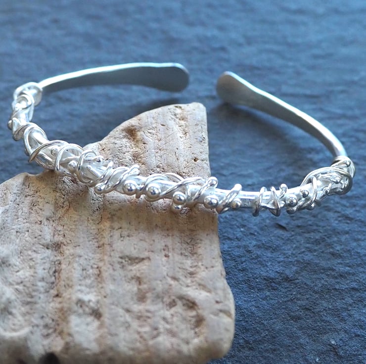 Pieces of silver have been twisted, wrapped and fused to this forged silver bangle to create a lovely flowing organic feel to the design. The bangle has been hammered with a vintage hammer and burnished to a bright shine.