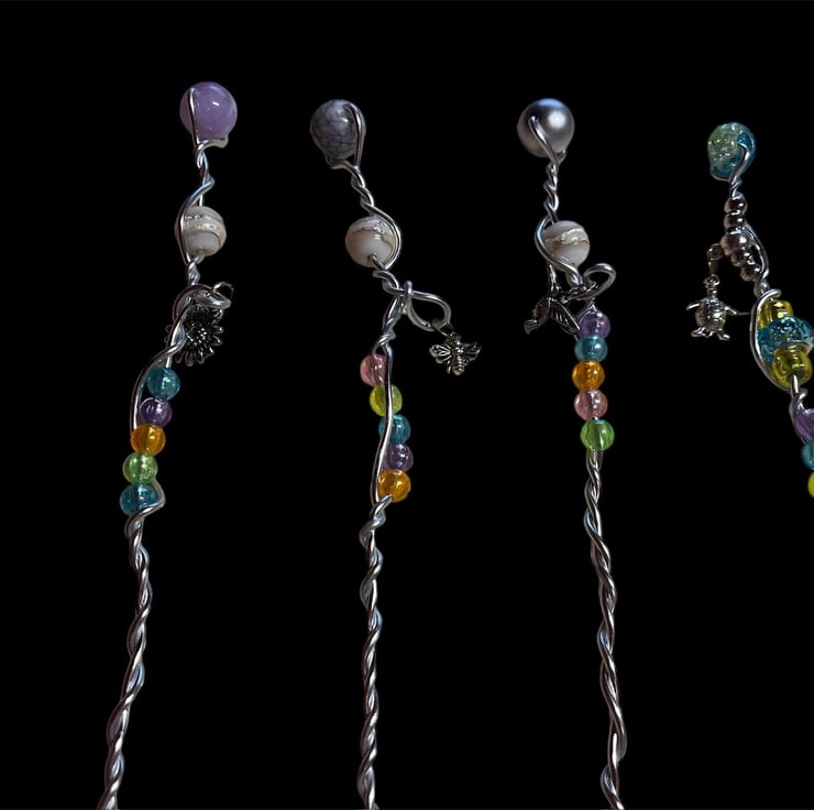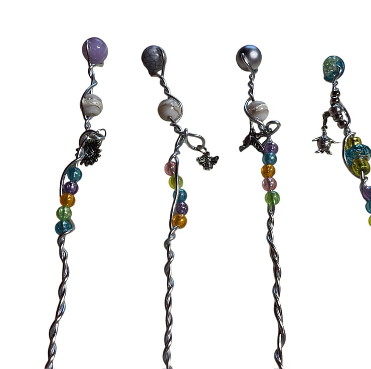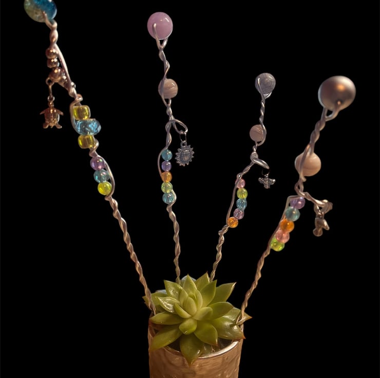 Each beaded stake is meticulously handcrafted using a unique blend of metal wire and charms and resin beads in an array of textures and colours which look like little fairy wands.