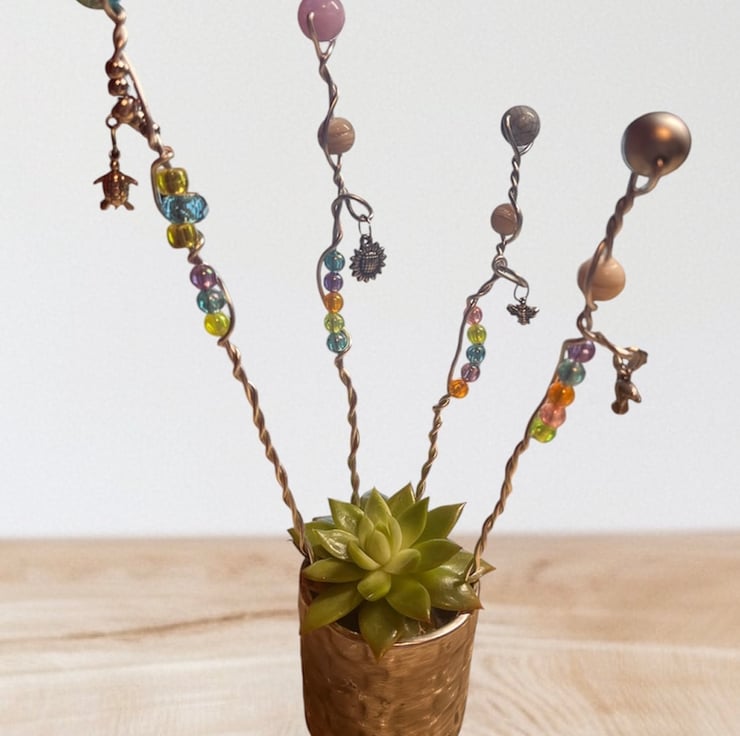 This set plant pot stakes are made from a combination of charms, beads and wire.
