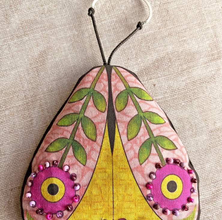 The lavender bag moth is my own design which I've had printed onto cotton fabric. I've embellished it with seed beads and incorporated the antennae into the hanging loop. The back of the bag is plain black.