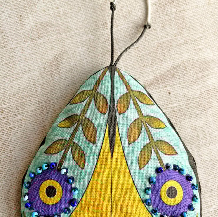 The lavender bag moth is my own design which I've had printed onto cotton fabric. I've embellished it with seed beads and incorporated the antennae into the hanging loop. The back of the bag is plain black.