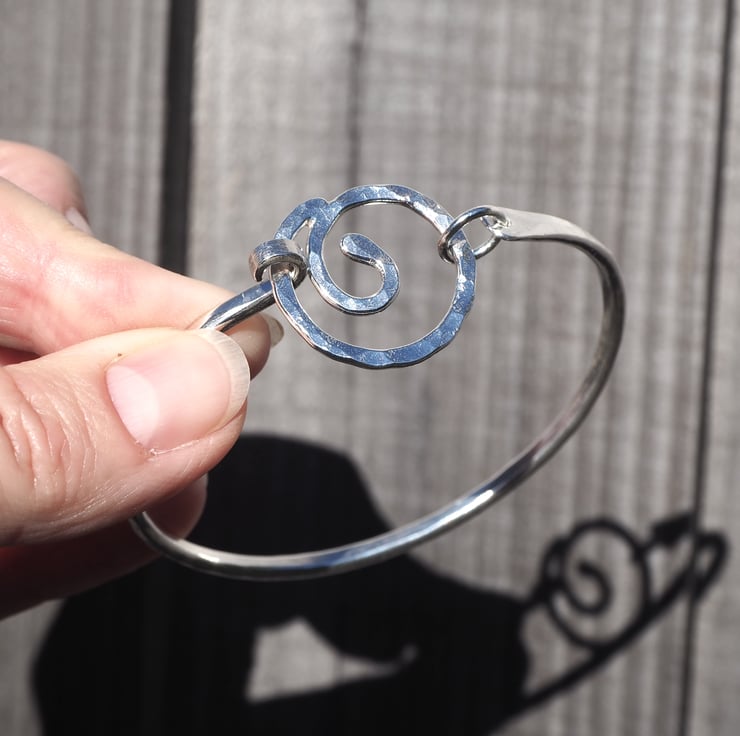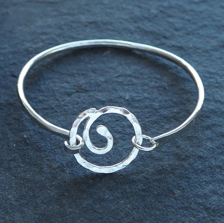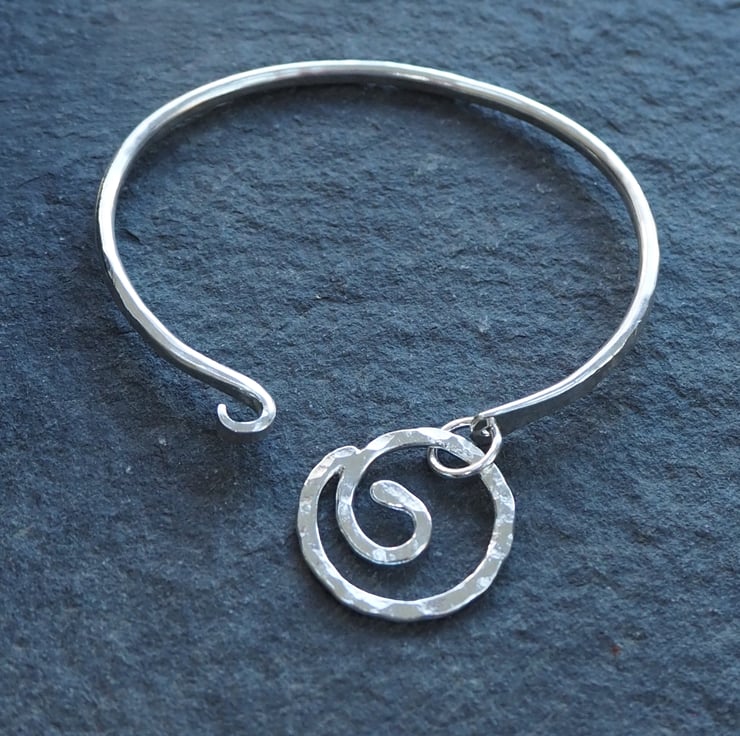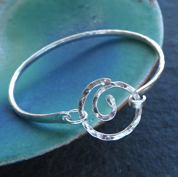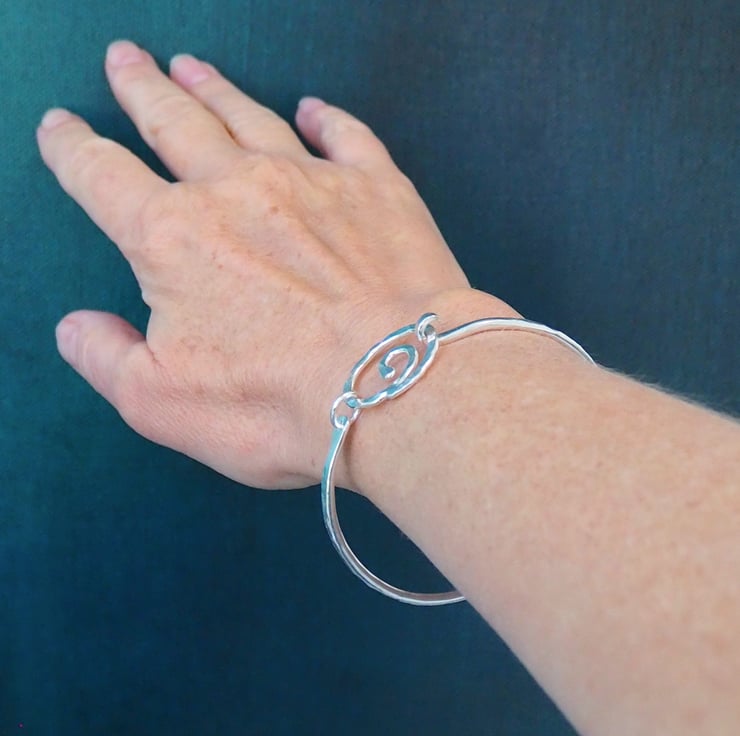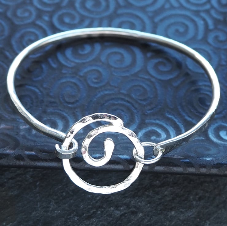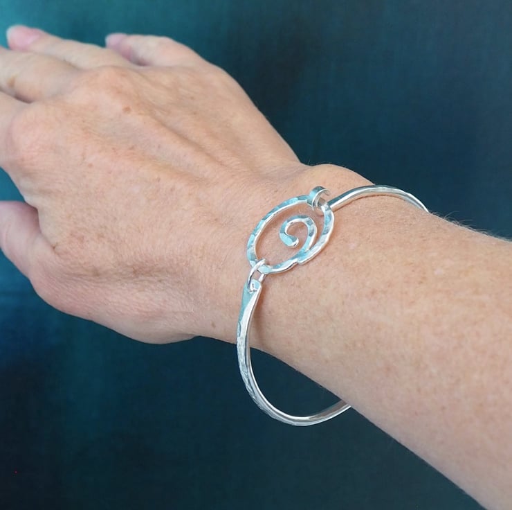 A forged silver bangle with a spiral focal point. The spiral opens up allowing the bangle to be slid sideways onto the wrist rather than over the hand if preferred. The bangle is oval in shape and has been hammered and burnished to give a lovely sparkly texture.