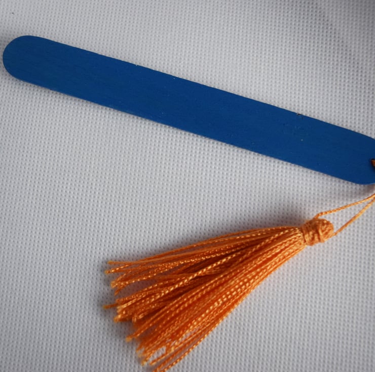 After painting in bright blue, the craft stick was sealed with an acrylic gloss varnish. The bookmark is finished off with a handmade yellow rayon tassel.