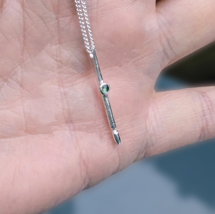 Sterling Silver pendant set with a beautiful little 3 mm cabochon cut tourmaline. Heat textured and forged I have shaped the bottom of the pendant into a nib design