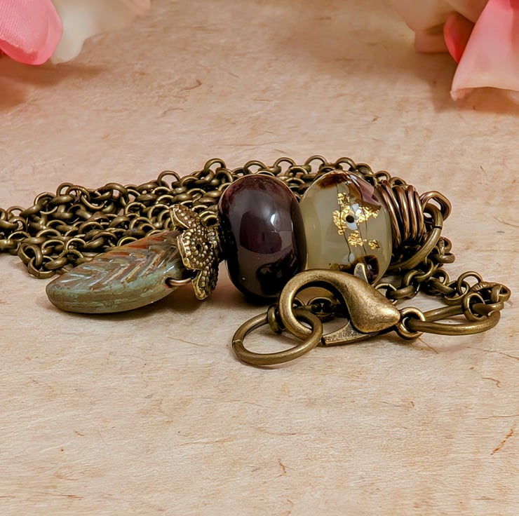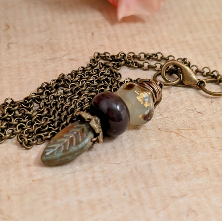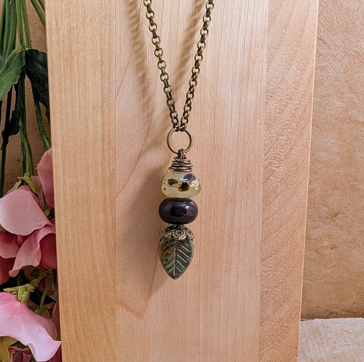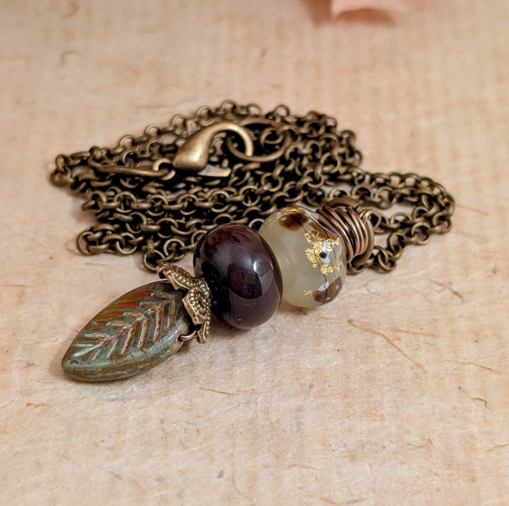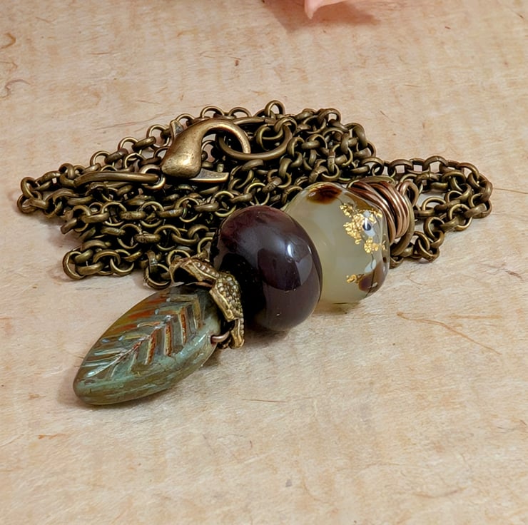 This elegant necklace features a beautiful pendant made from a selection of glass beads. A green Czech glass leaf has been teamed with a simple maroon lampwork beads and another one that has a translucent gold base with maroon and gold detailing. The pendant is attached to a length of antique gold coloured chain that fastens with a lobster clasp.