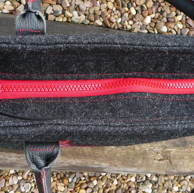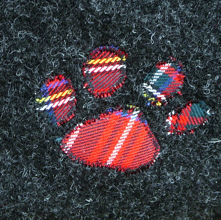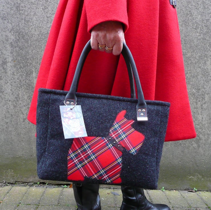Made from British wool tweed in black with black real leather handles and a Royal Stewart tartan applique Scottie dog, I have also used a Royal Stewart cotton tartan lining. This handbag is handcrafted from start to finish by myself, I even made the handles. This tweed purse features a semi solid bag base with bag feet, leather carry handles with red top stitching and silver nickel bag hardware, a recessed zipper top closure. There is a Scottie dog applique on the front with a paw print applique on the back. Inside the bag is fully lined in a Royal Stewart tartan cotton and features a zipper pocket and a slip pocket.