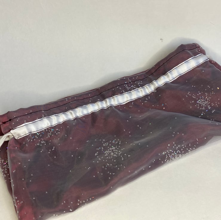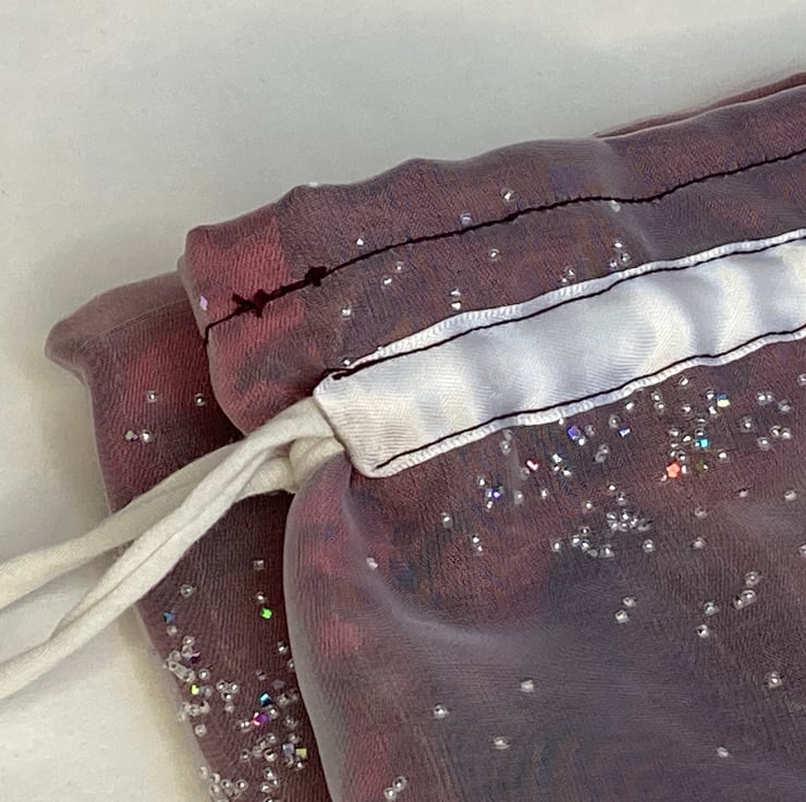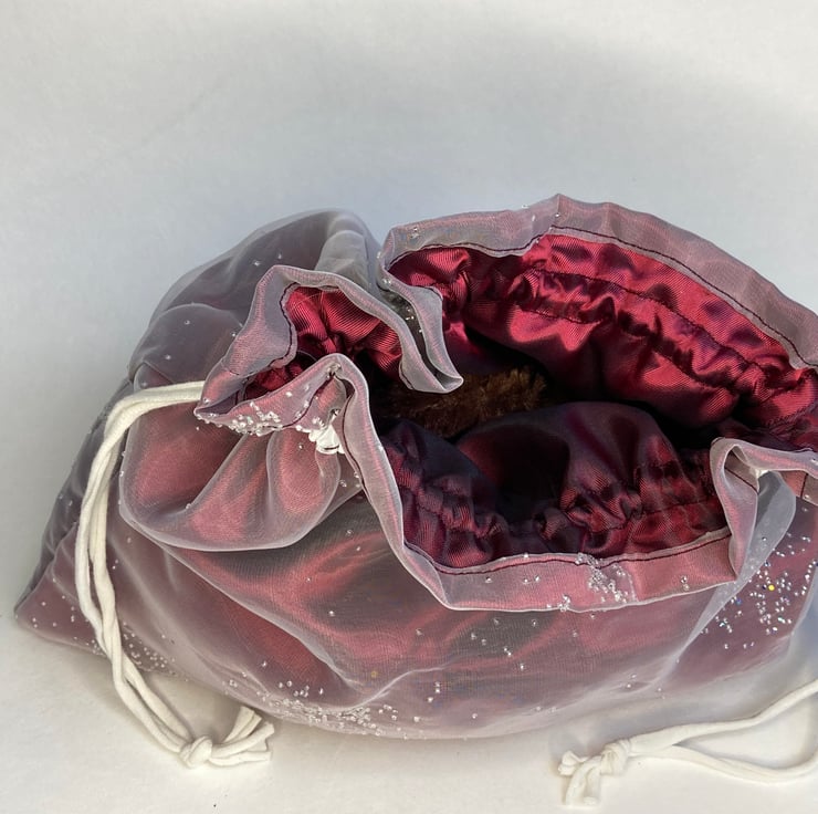 This special bag is made from some white chiffon fabric, decorated with sparkles. It is lined with a rich burgundy lining and has a white drawstring closing. The double layer of fabric conceals the contents and the drawstring makes both wrapping and unwrapping a pleasure.