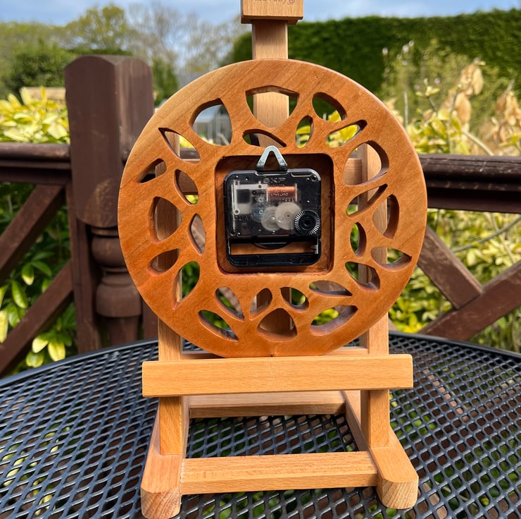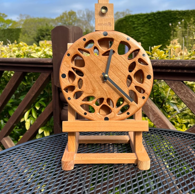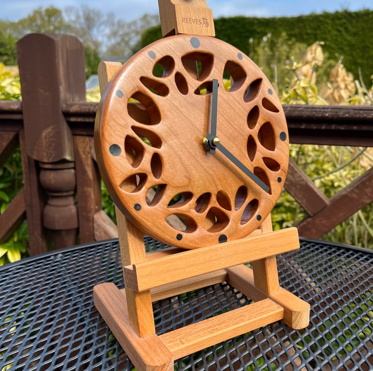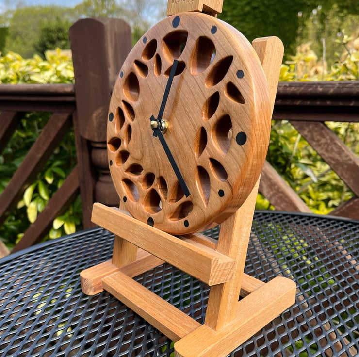 This unusual wall clock would make a great gift for any age or occasion. This attractive design is charecterised by the irregular cutouts in the clock face interspersed with black dial spots. Each cutout has been sanded to round the edge giving a very pleasing and tactile decoration. The body of the clock is made from a single piece of cherry wood with contrasting black dial spots and baton hands. The clock is finished with a durable drying oil providing a deep satin sheen. The clock is fitted with a Seiko SKP quartz mechanism which is both very quiet and reliable. The mechanism has been run for 12 hours to ensure its integrity.