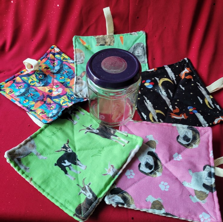 A useful tool to help open jars and bottles.These make a great gift for older relatives or anyone who ever struggles to get the lids off jars. Cotton fabric with a rubber backing which gives a strong grip to loosen the tops of jars and bottles. I've added a hanging loop for hanging up in the kitchen.