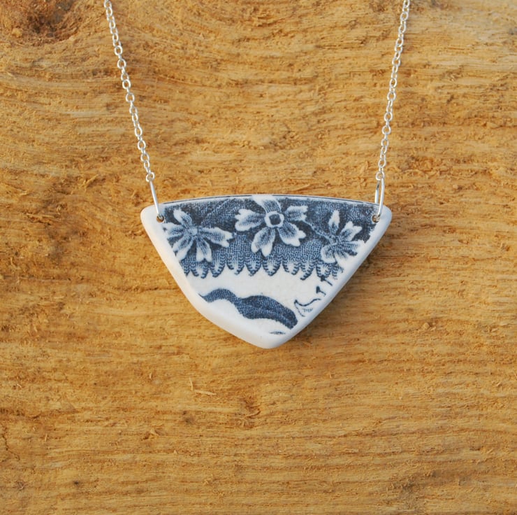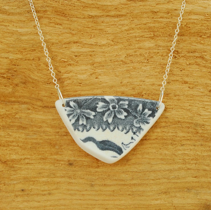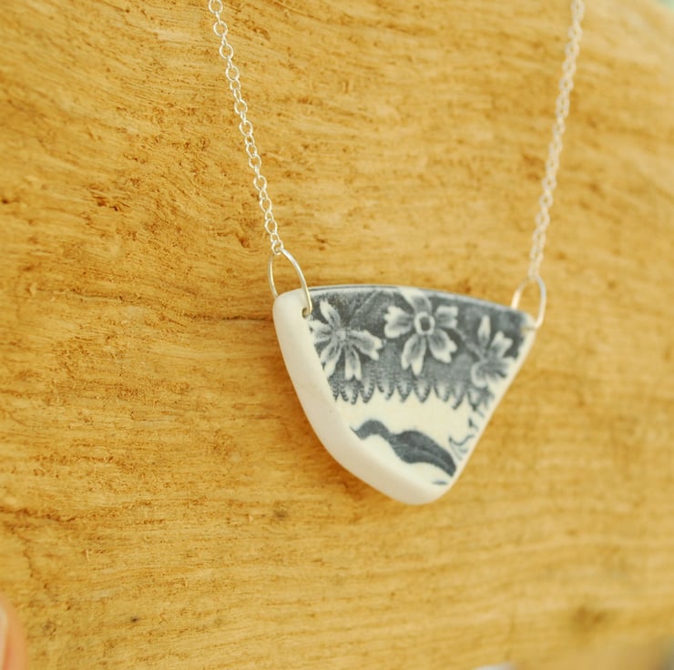Black flowers are very unusual on old pottery, so we were thrilled to find this piece on the beach. The pendant is a piece of a plate or shallow dish. We have tumbled the pendant so it is clean and smooth, and mounted it using sterling silver.
