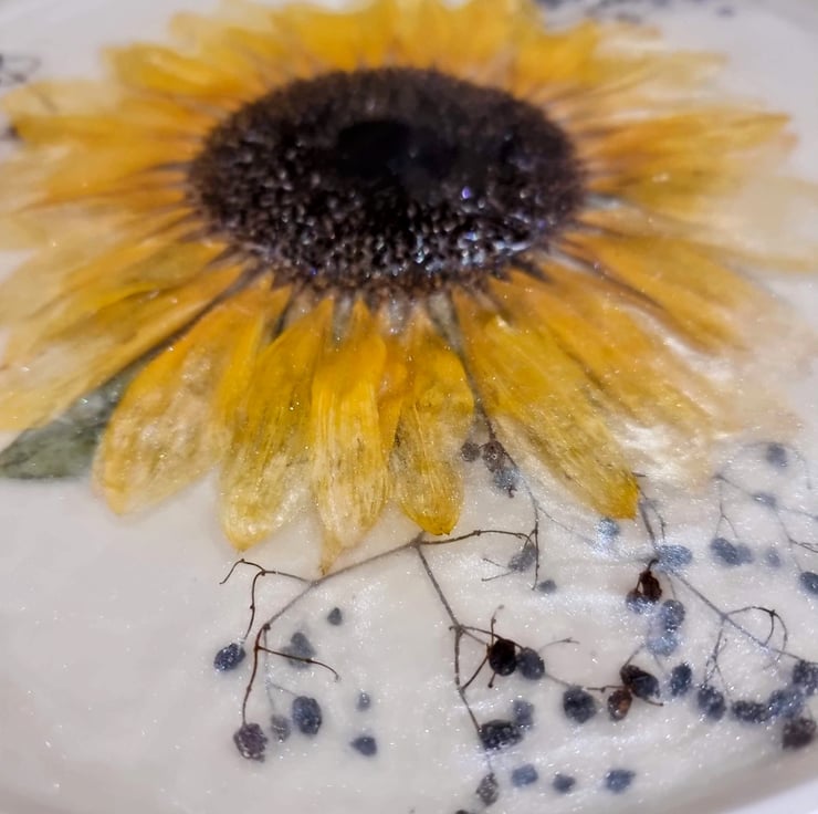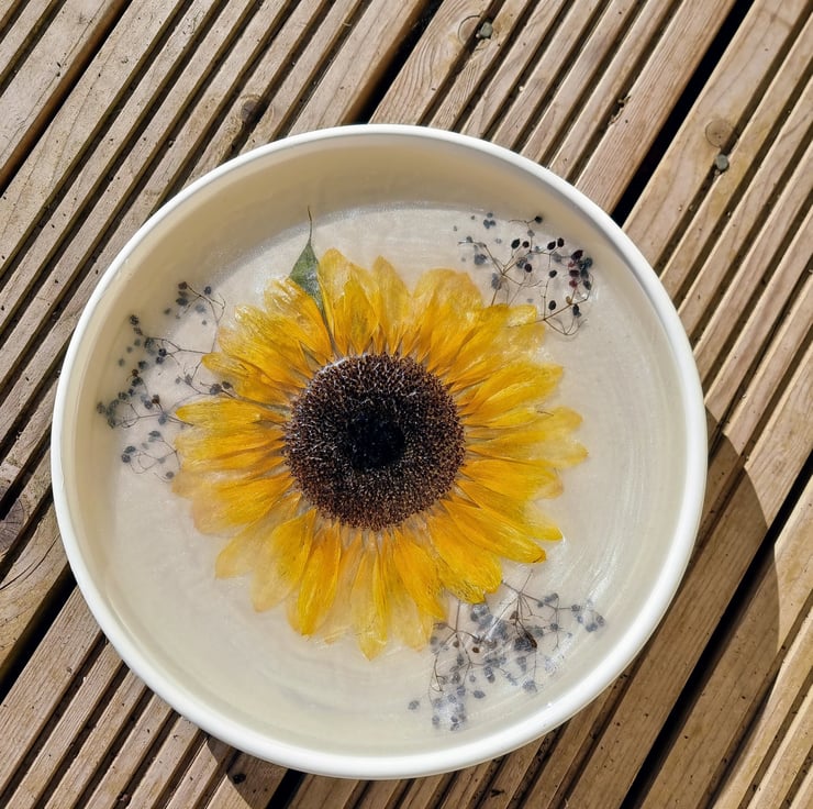The tray is crafted using epoxy resin, a clear, durable material that allows for intricate designs & preserves the natural beauty of flowers. The base is made of white metal (not by me, not hand-crafted). Inside the resin are real dried sunflowers arranged artistically in circular patterns to complement the rotational design. The flowers are sealed into resin, giving a stand glass-like finish while protecting the florals from damage or fading over time. A bit of glitter was added to enhance the aesthetic.