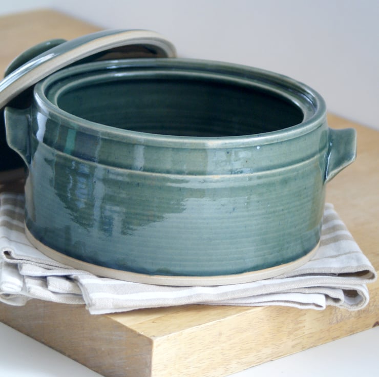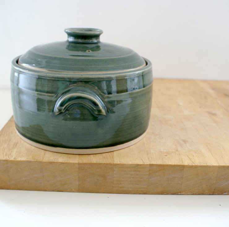 This hand thrown stoneware jar is a functional piece to add a touch of handmade charm to your home. Crafted on the wheel using white stoneware clay if features a distinctive barrel shape with ridges near the top adding texture to the piece. The domed lid with small decorative knob sits securely on an internal rim edge on the body of the jar. Two small lug handles are also on the piece to help lift it since it has a wide shape. The jar has been dipped in a cool ice blue glaze with a glossy finish. The base is flat and stamped with the Little Wren Pottery Logo.