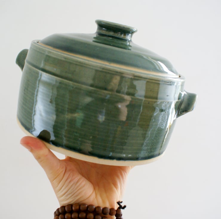The jar is 7.4 inches (19 cm) in diameter and 3.5 inches (9 cm) in height without the lid. This piece has been discounted due to some white speckling with the glaze on the inside of the jar.