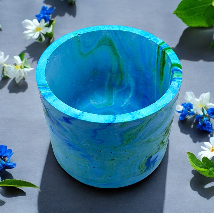 The beautiful colours of the sea inspired me to make this plant pot. I used blues and greens to create the seascape effect and then added a small amount of green biodegradable glitter to give it a few subtle shimmery patches. The beautiful marbling effect makes each pot a unique piece of art, making it an ideal gift for a special person or a lovely treat for yourself.