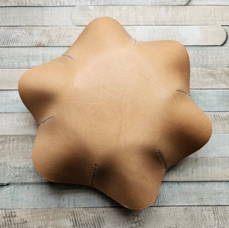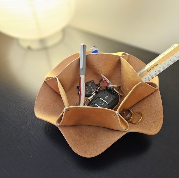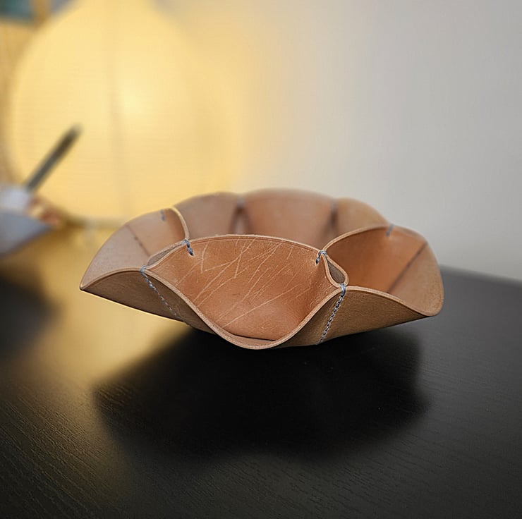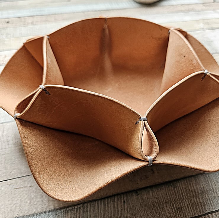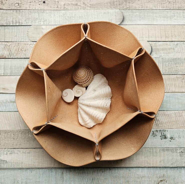 Handmade leather storage/ trinket bowl. Made from natural veg tanned leather. This leather has been finished with oil and wax but will naturally tan if placed in sunny areas- which depending on your personal preference can add character and beauty to the piece. The marks on the leather are part of the natural hide itself.