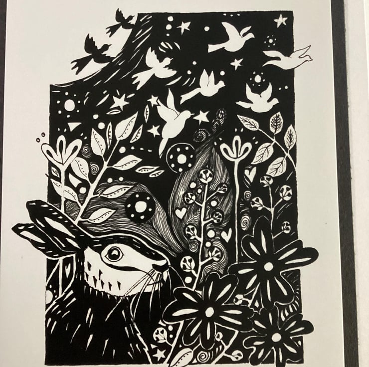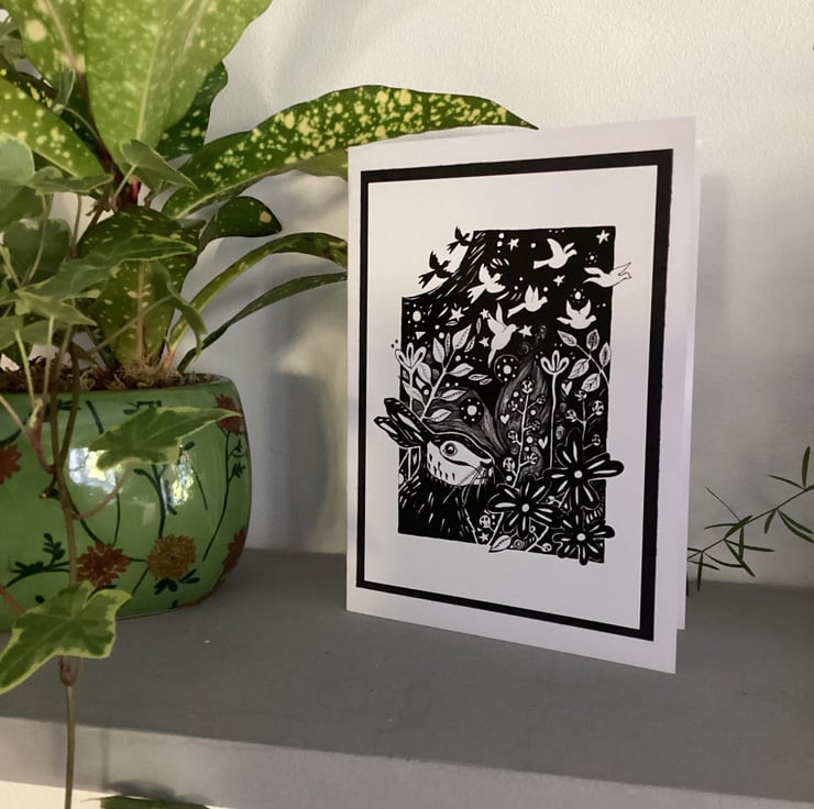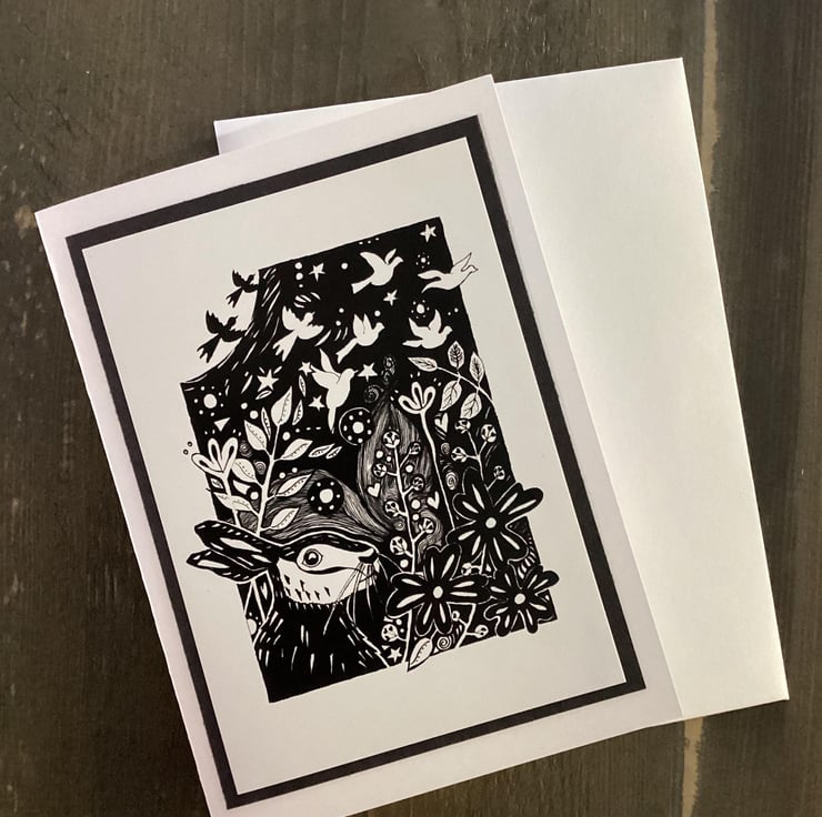 Black and white greetings card - mystical hare, moon and birds - blank for your own message