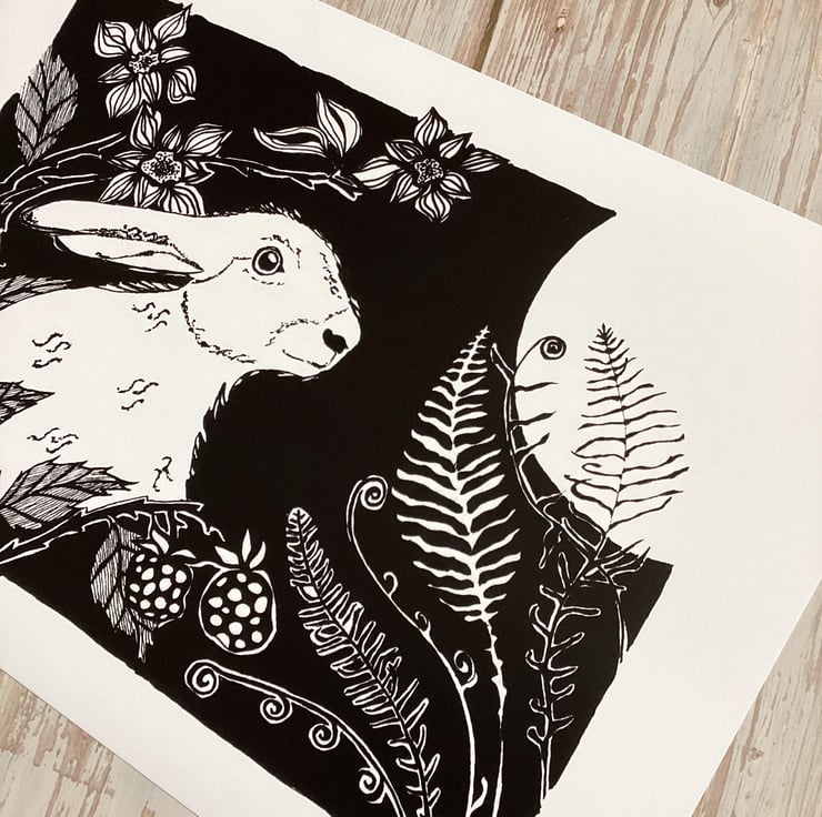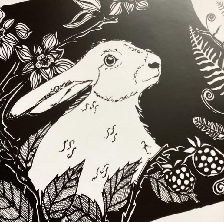 The mystical moon gazing hare in the moonlit meadow amongst the ferns and brambles.