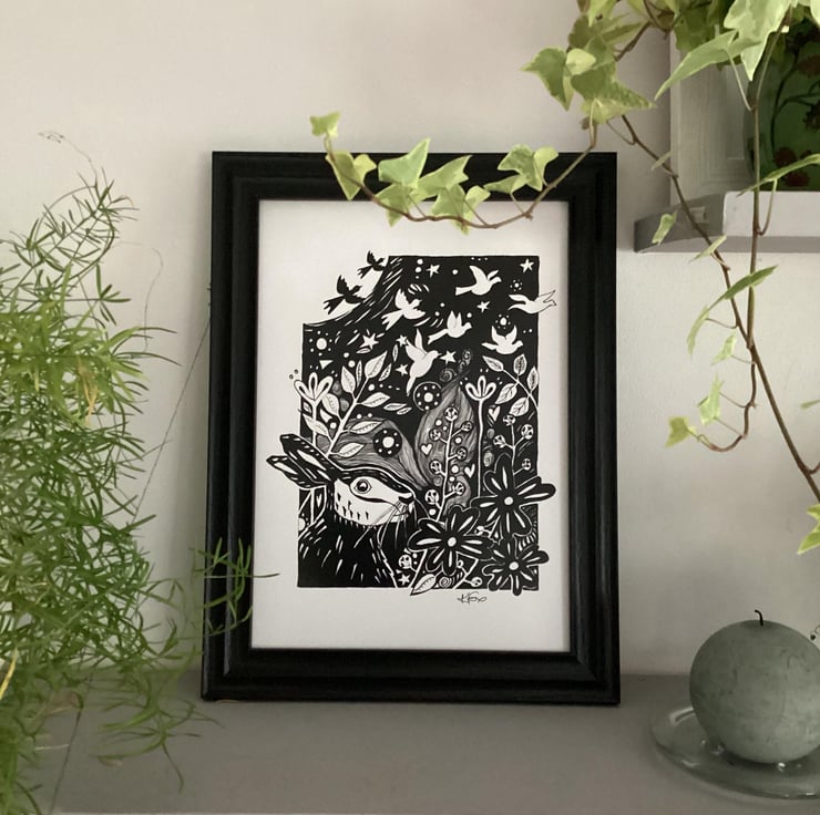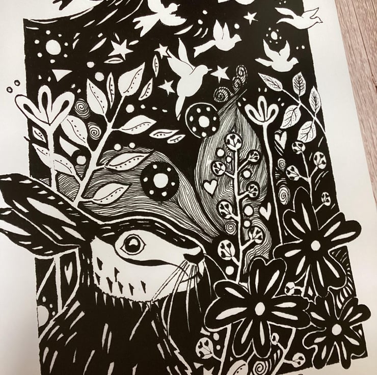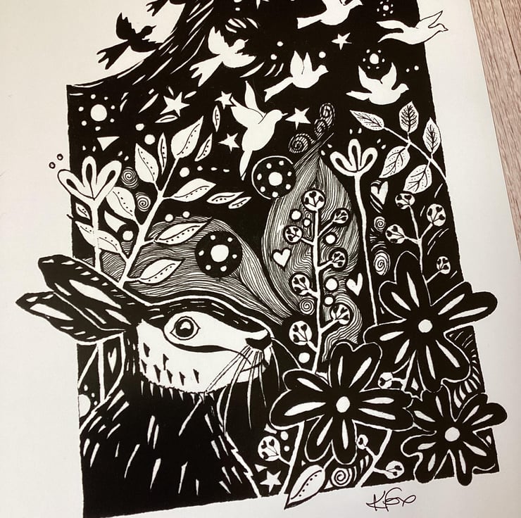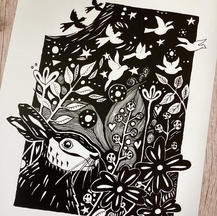 The mystical hare in the moonlit meadow amongst the leaves and flowers he watches as a flock of birds suddenly rise up into the night sky.