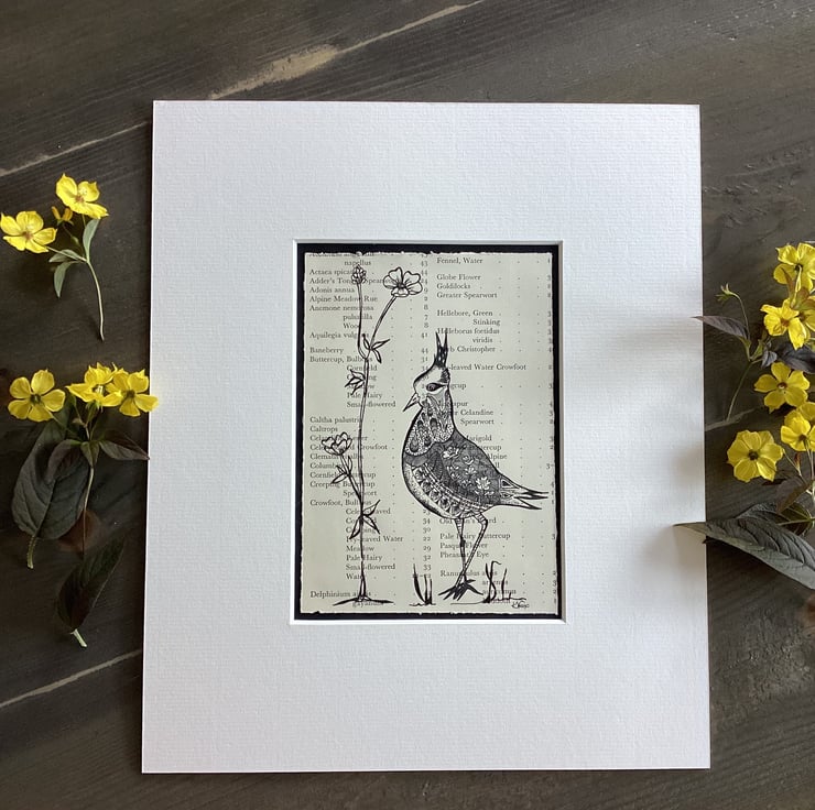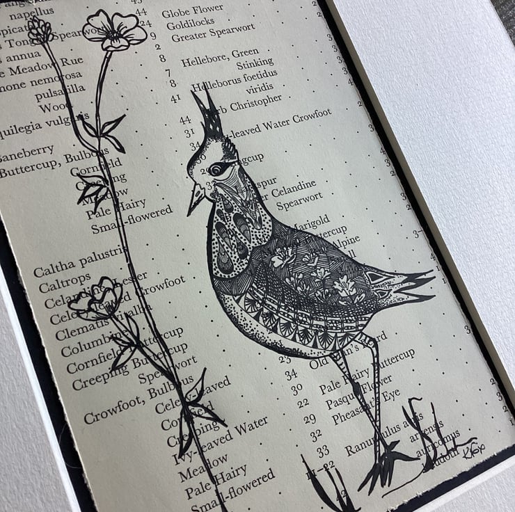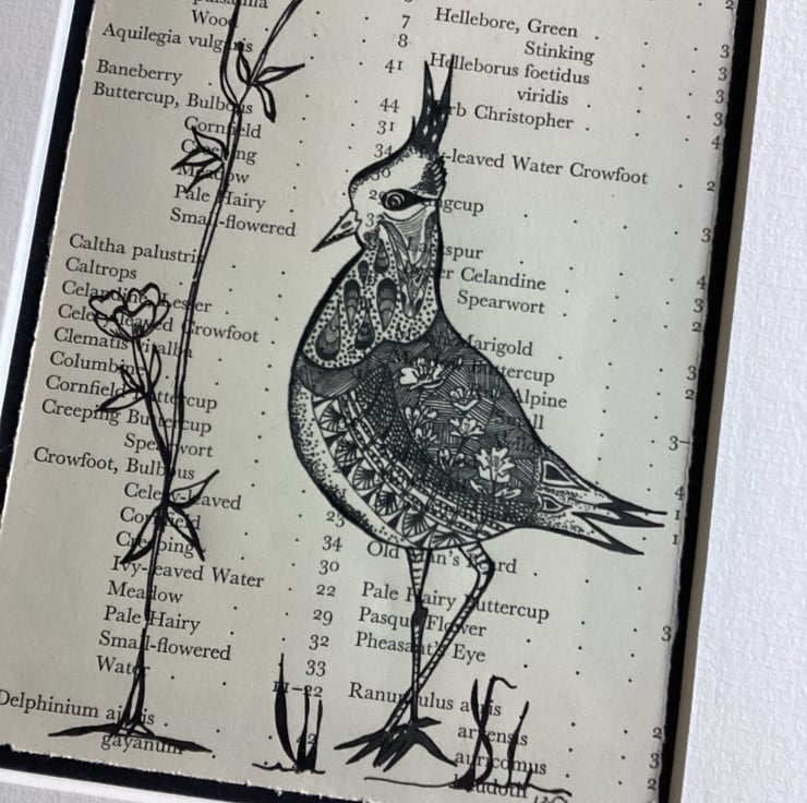 A unique lapwing illustration combining zentangle inspired patterning with a blend of print and original artwork. The bird is intricately detailed with patterns that add depth and texture. It is drawn onto a piece of vintage paper - a repurposed index page from an old horticultural book - giving the artwork a sense of history and charm.