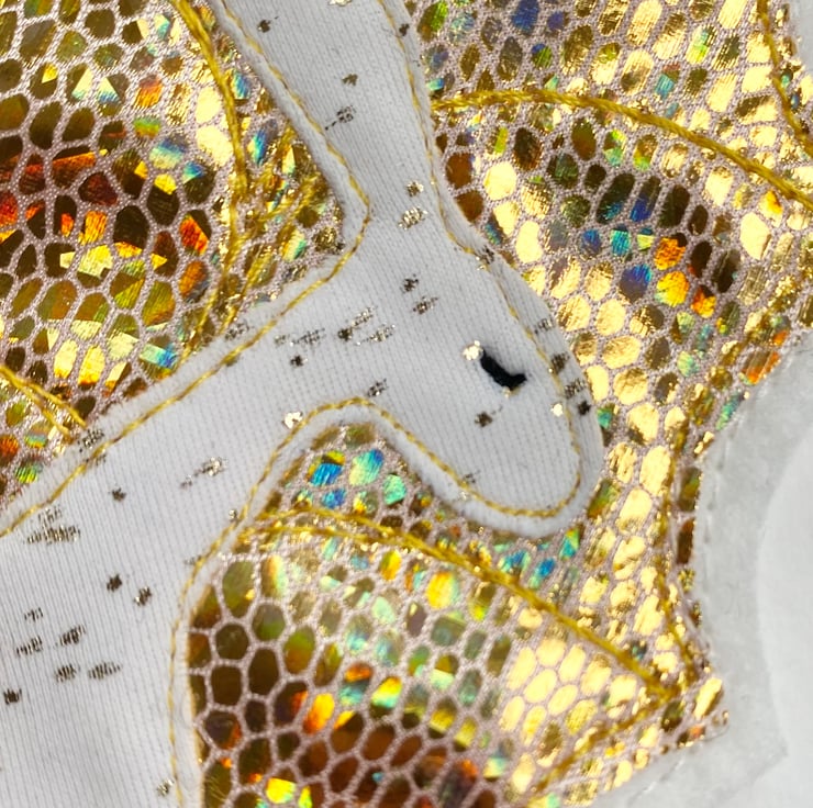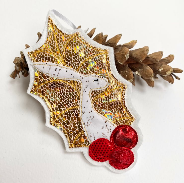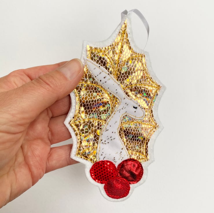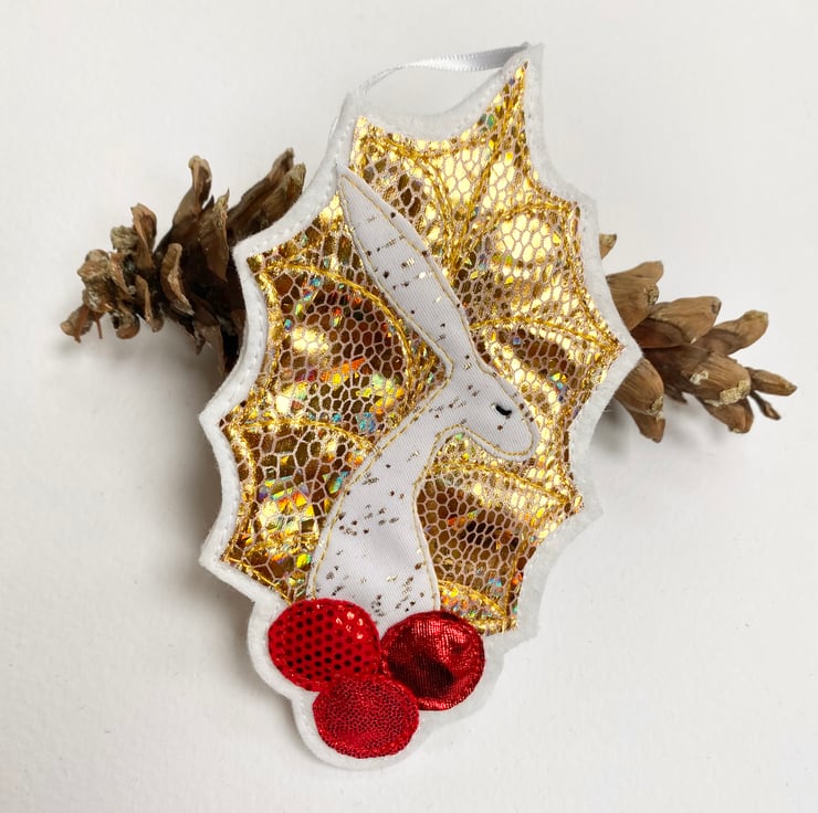 This seasonal embroidered hare home decorations shows a hare framed by a holly leaf with berries. It has been made from up-cycled fabrics and stitched down with free motion embroidery. It comes felt backed and measure approx 8 x 13.5cm, with the ribbon the length is 20cm.