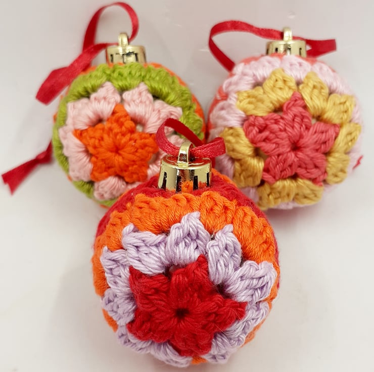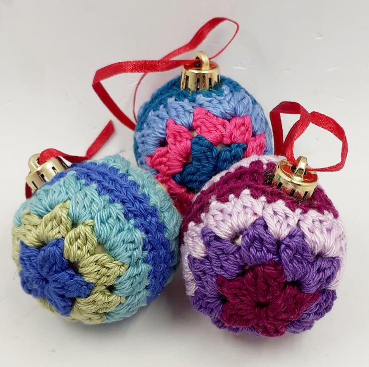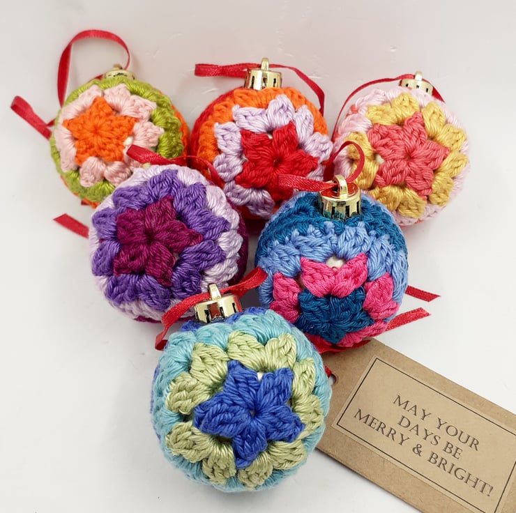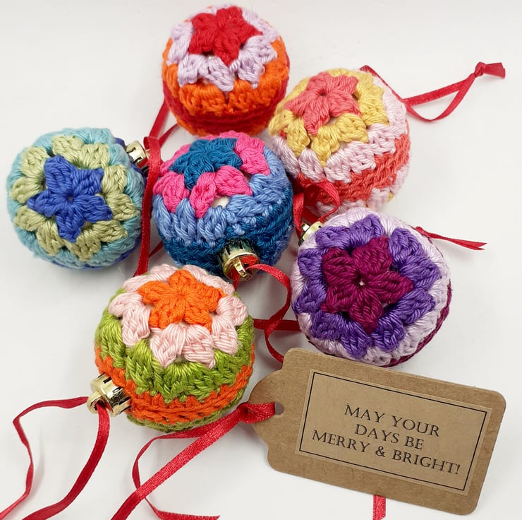 These pretty baubles have been crocheted in cotton over 4cm plastic baubles. They have narrow ribbon hanging loop and a gift tag is included which reads 'Mat your days be merry and Bright!' although I am very happy to exchange this tag for one with wording of your choice can.
