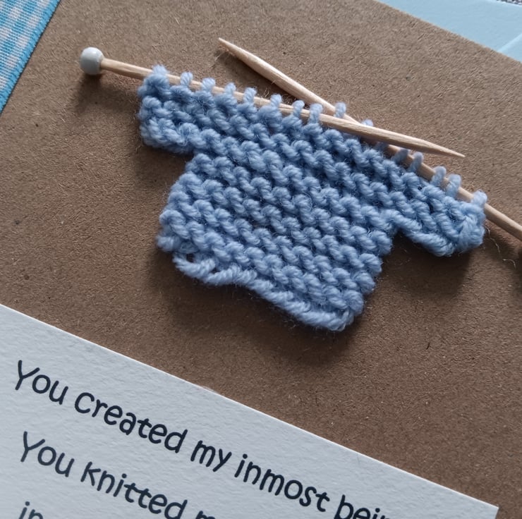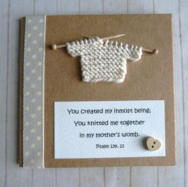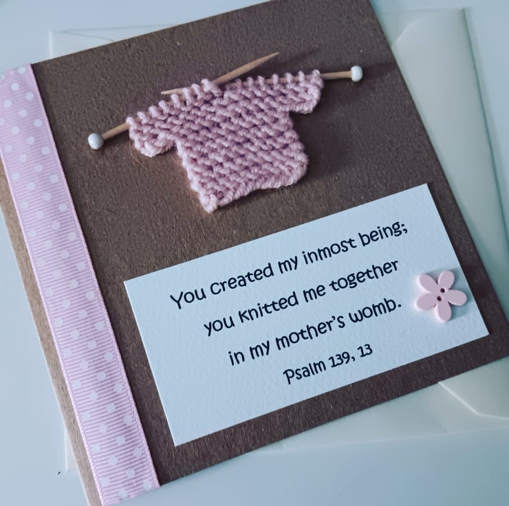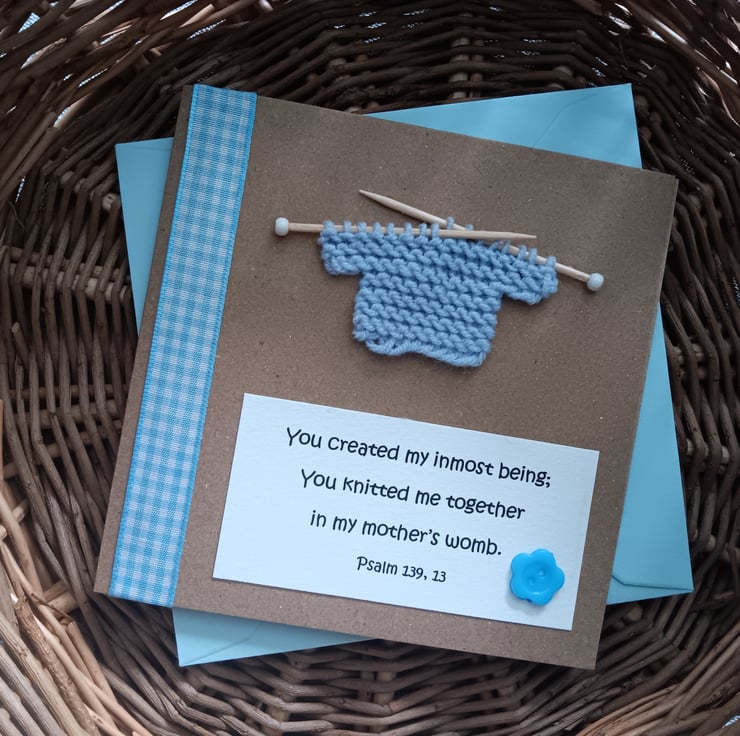The knitted jumper is knitted by me in pale blue wool and then transferred onto my handmade tiny knitting needles. The text from Psalm 139 is printed on inkjet Bockingford watercolour paper. The card is finished with a matching length of ribbon and a flower shaped button. This card is also available in pink and cream (see separate listings).