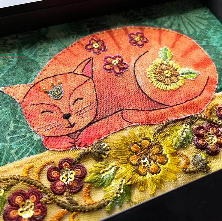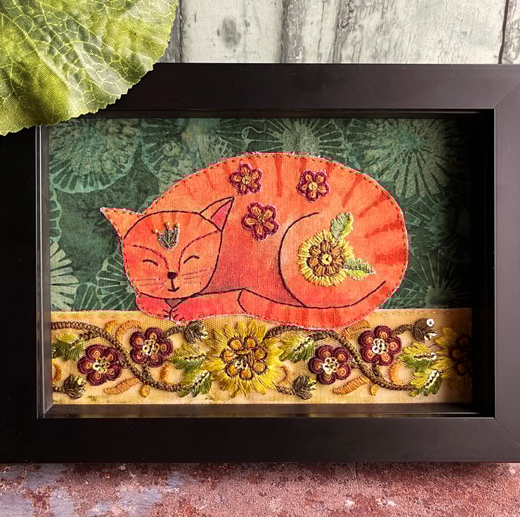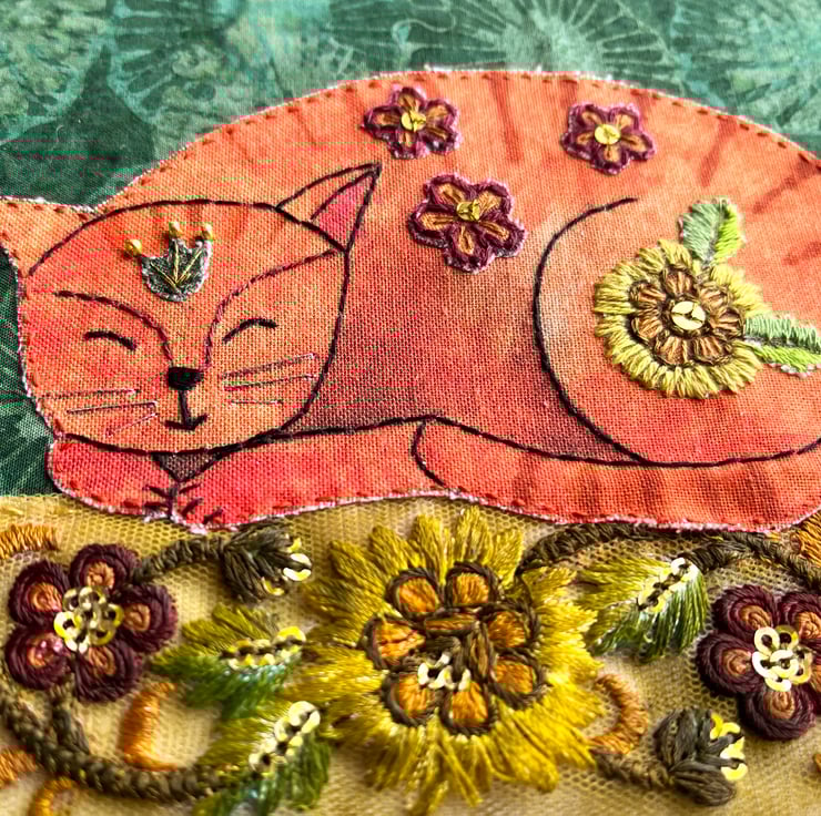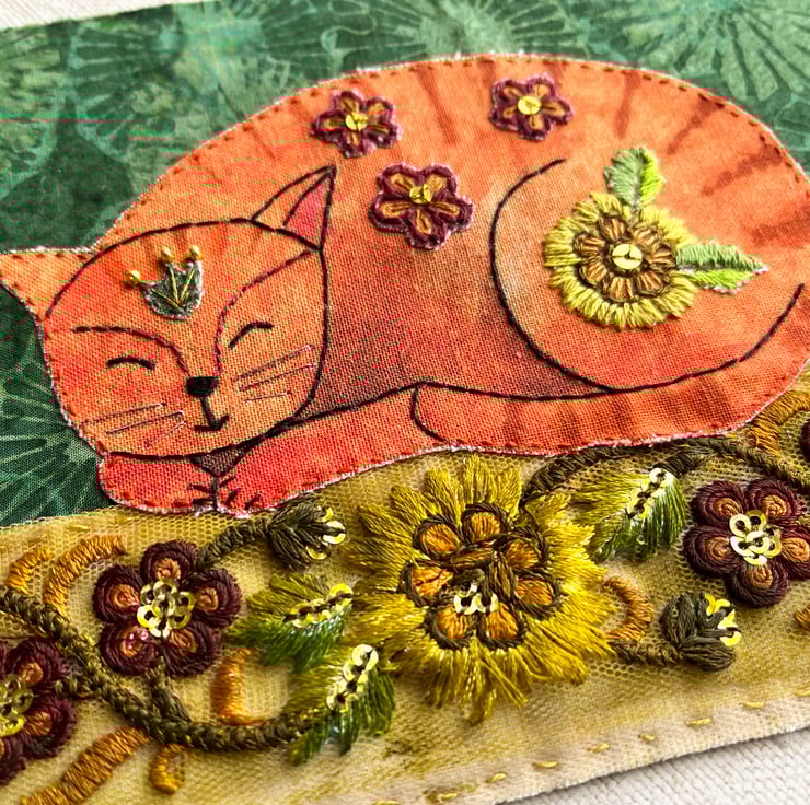 I've used a strip of floral embroidered trim for the base and given it a wash of acrylic paint to create a vintage feel. The background is made from a piece of batik fabric. My cat illustration has been printed onto cotton and embellished with paints and embroidery threads. I've added flowers and leaves to his back and head, echoing the colours and shapes of the flowers in the trim. I've added a few gold seed beads and sequins to give a bit of sparkle.