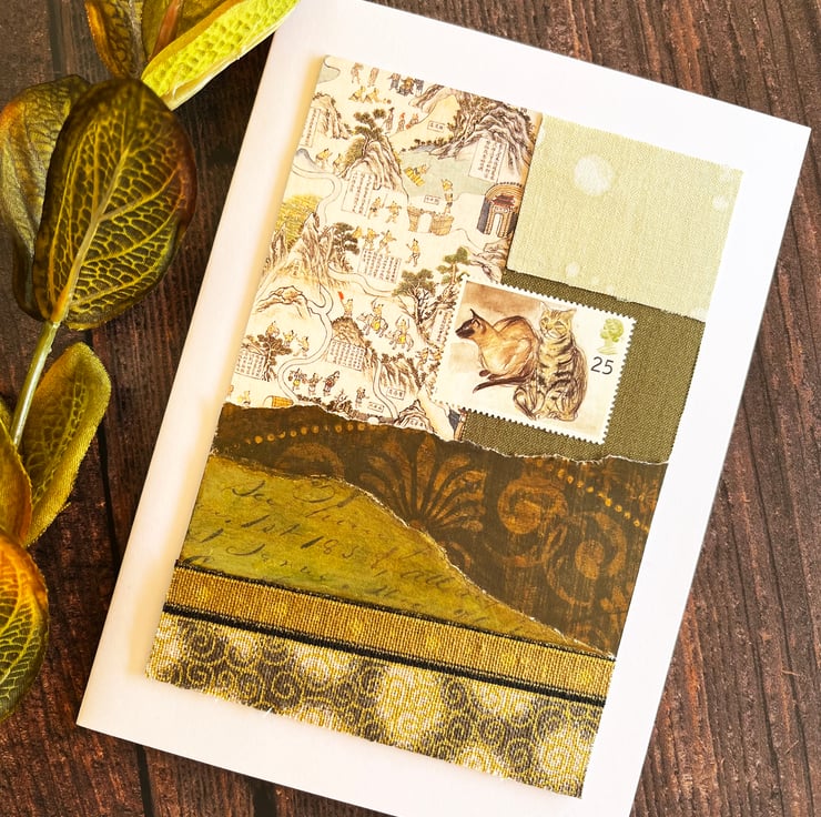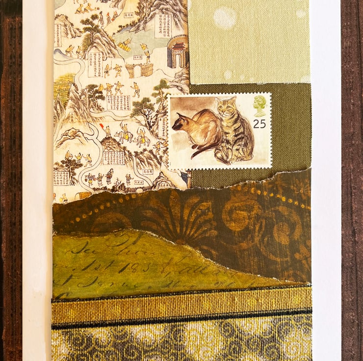I've made a postcard-sized artwork using layers of decorative papers and fabrics, including batik and added a pretty postage stamp with a Siamese and grey tabby cat as the focal point.