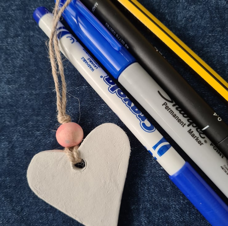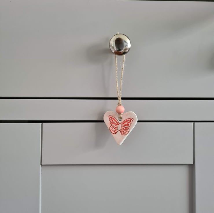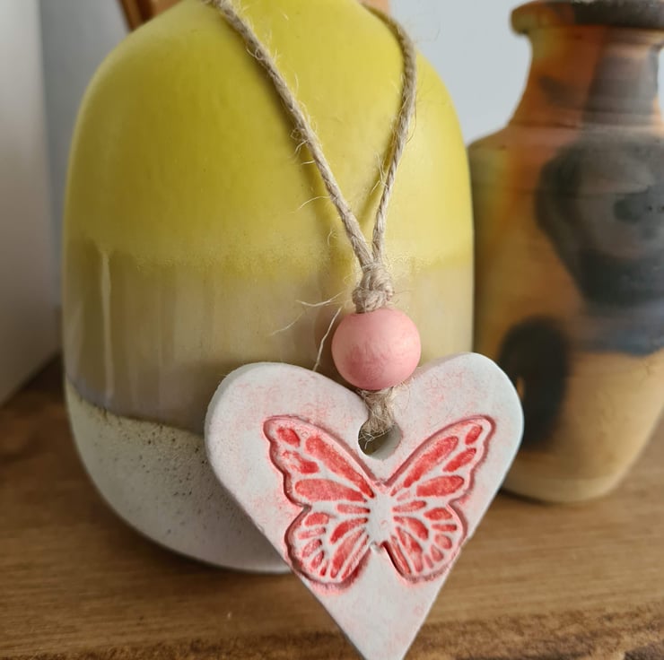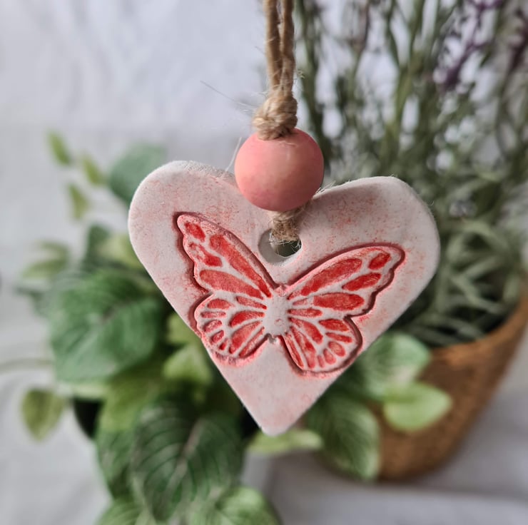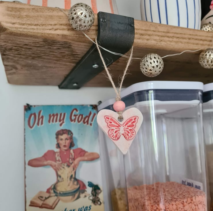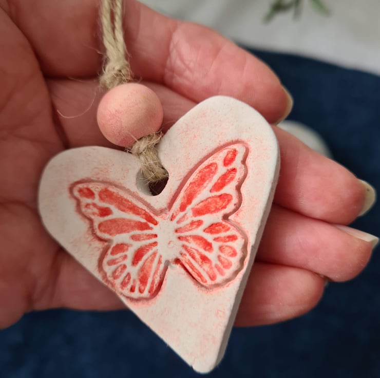 This pretty heart shape butterfly hanging decoration is made from air-drying clay, which I have embossed with a pretty butterfly design. I've painted the decoration in a red colour before varnishing and finishing with jute string and a matching bead.