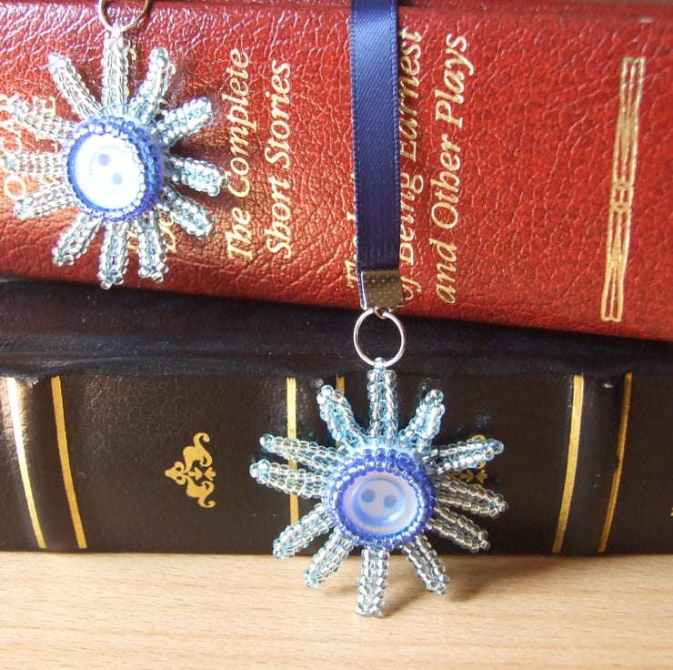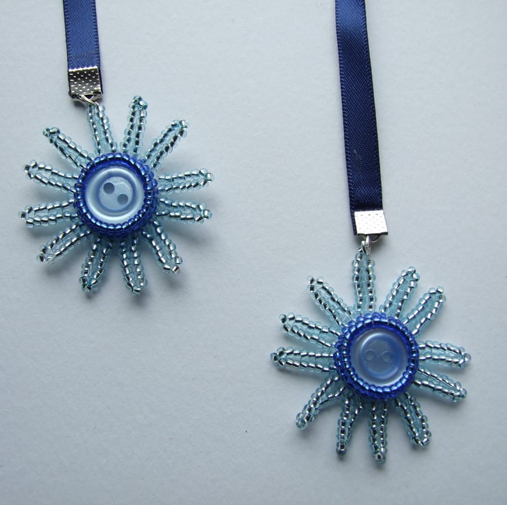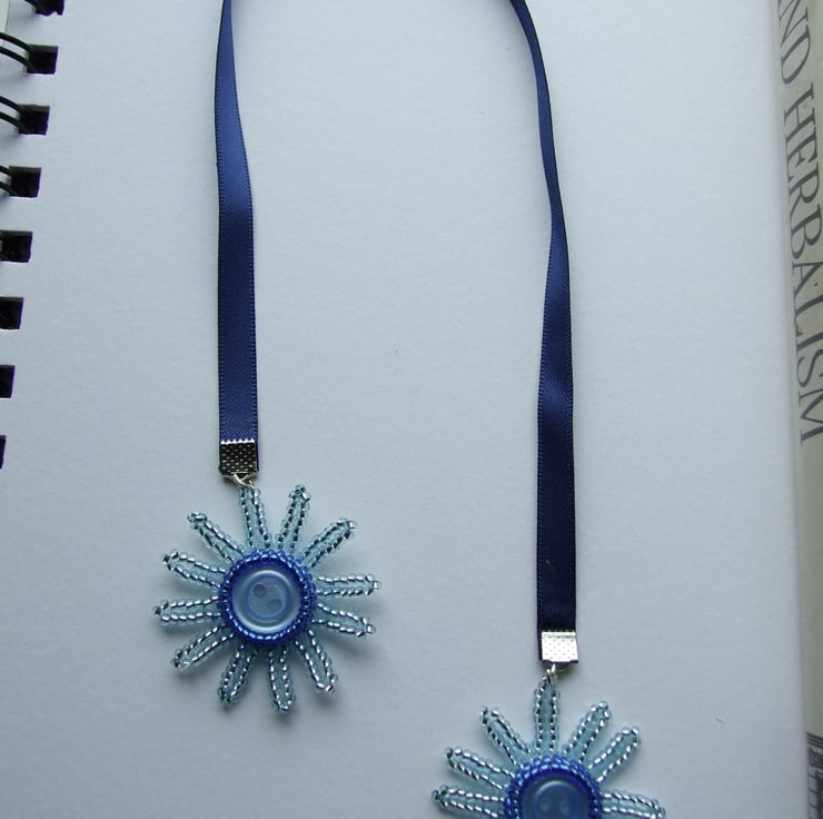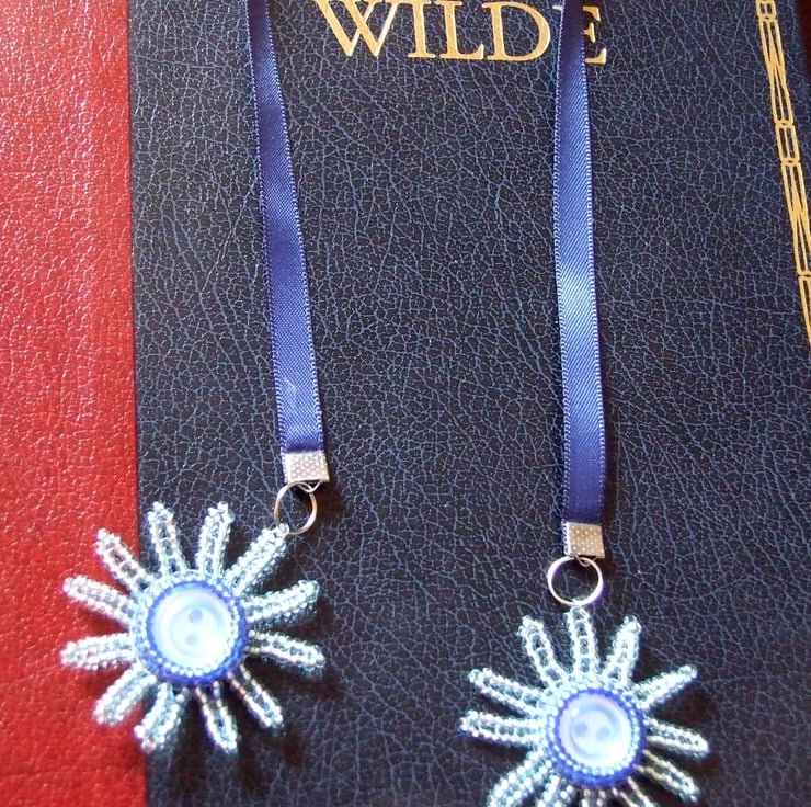 This gorgeous, one of a kind ribbon bookmark features two handwoven beaded daisies. These dangle beautifully from each end of a navy blue double sided satin ribbon that fits snugly between the pages of your favourite book.