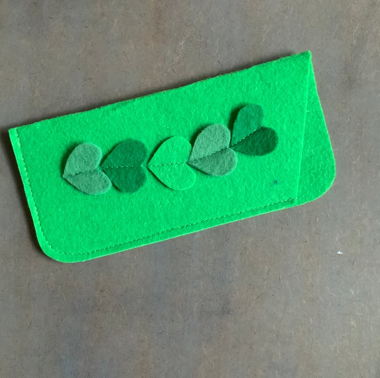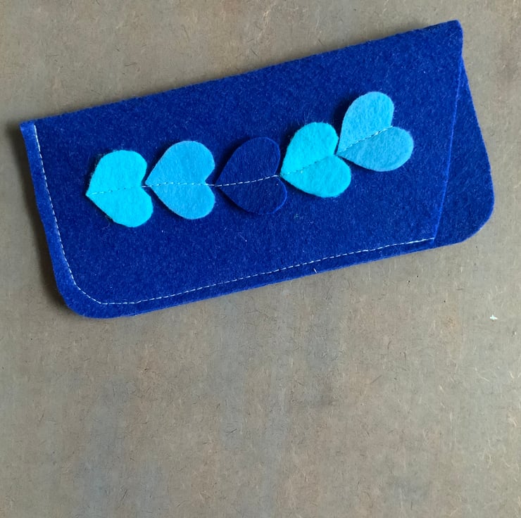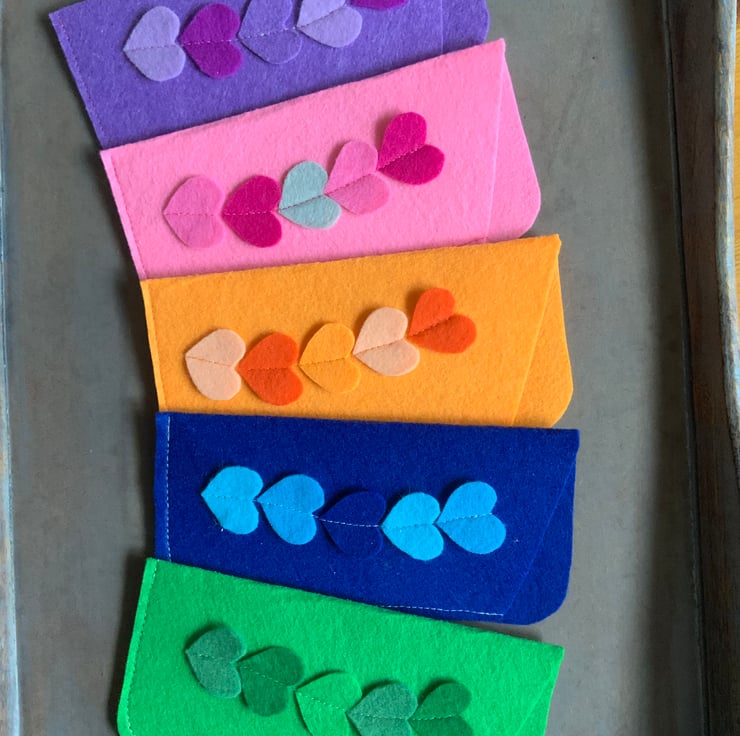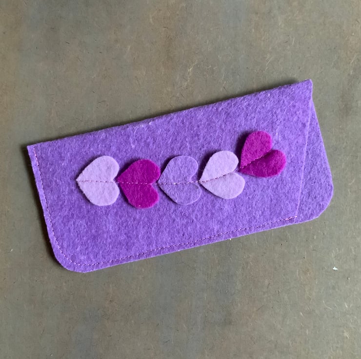 Handmade felt glasses case with heart motif. The case is made with synthetic felt, in a choice of five colours. Please select your colour choice.