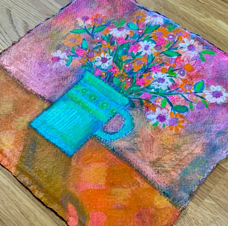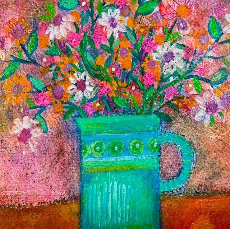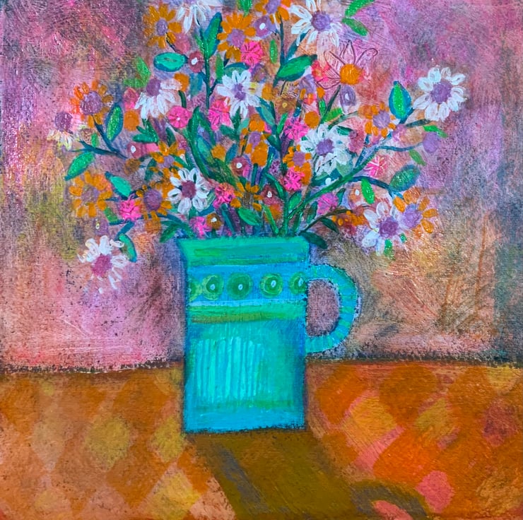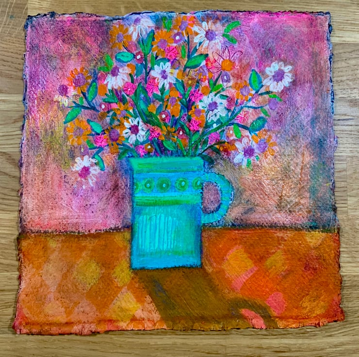 This is an acrylic and pencil mixed media painting, painted on Indian Khadi watercolour paper. It measures approximately 21.5x21.5cm and comes unmounted and unframed allowing you to choose a frame in your own style. It is a still life painting of a jug of flowers painted in lovely warm tones to create a happy painting