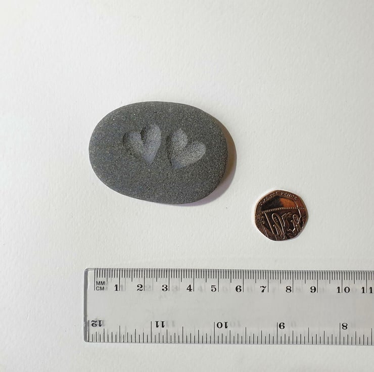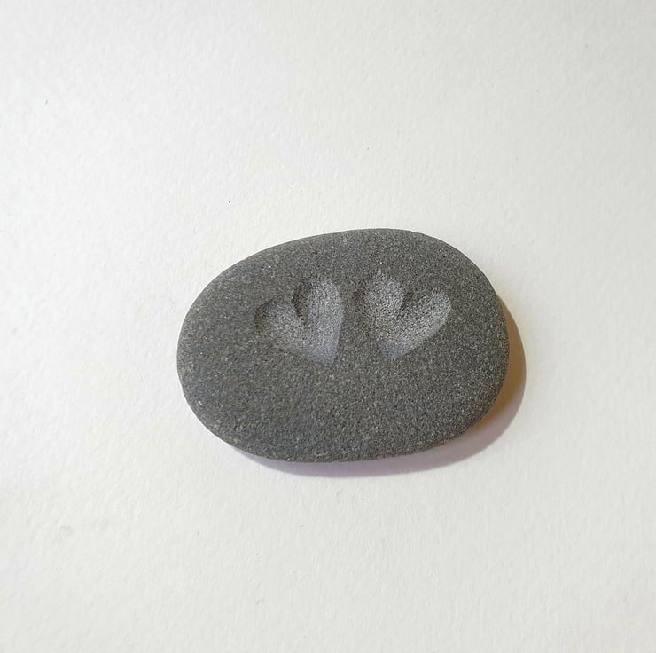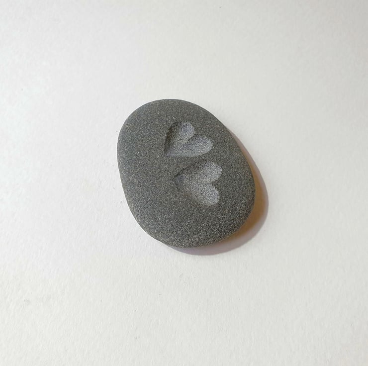 A brown, sandy biege or grey stone, deeply engraved with two hearts to give a contrast to the stone surface. This thoughtful gift could be used as a pocket hug, keepsake or an ornament for a desk, window cill or mantelpiece and given for a birthday, wedding anniversary, engagement gift, Christmas present or just to say thank you.