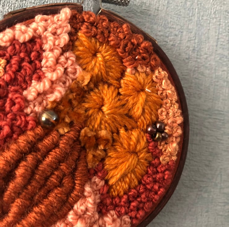Burnt orange a 3 inch one of a kind hand embroidered art piece. Embroidery thread, yarn and beads have been hand stitched into a burnt orange fabric in an abstract pattern. The piece has then been placed in a hand stained dark wood hoop creating a piece which is both eye catching and unique a perfect addition to any home.