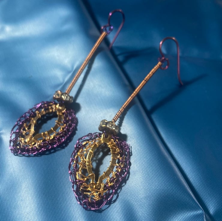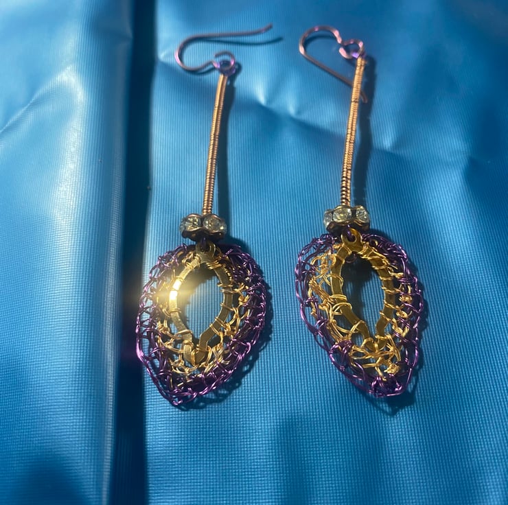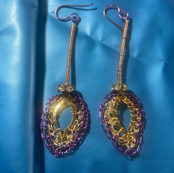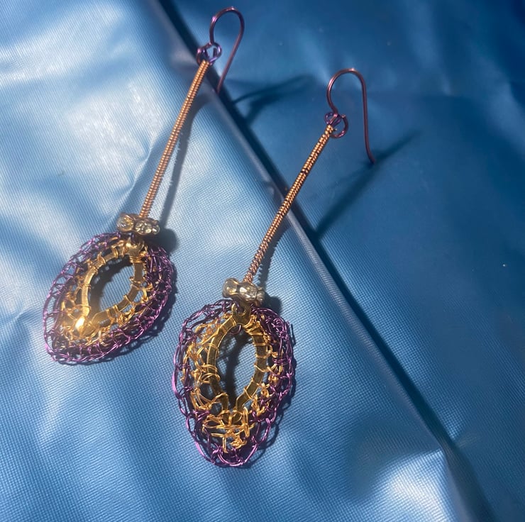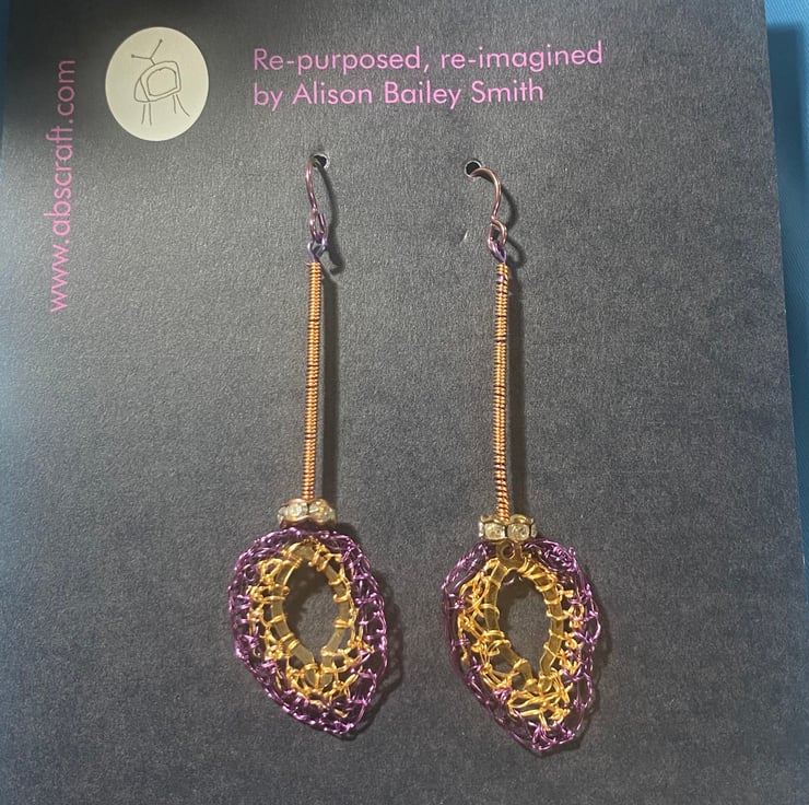 Now sold. Copper & Purple earrings- sustainable jewellery - repurposed and bought wire with metal and gems donated from a friend with Niobium hooks and eye pins. On a branded card in envelope with sticker and tissue paper gift wrapping - all sourced from sustainable or recycled sources. Exterior packaging repurposed. Free UK postage and packing.