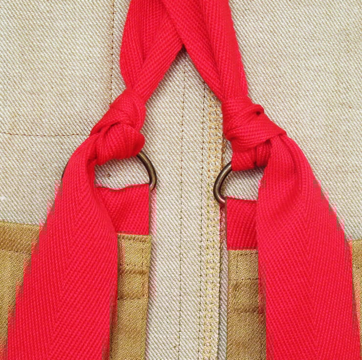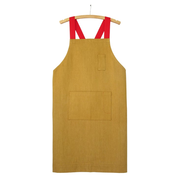 This was my second ever cross back makers apron design, I used the same shape as the first cross back apron but this time added adjustable straps made of herringbone webbing which knot through loops at the back corners of the apron. This beautiful golden denim and red webbing is such a striking combination on this design.