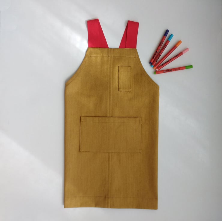 Pair of cross back aprons with adjustable straps, in beautiful and tough ochre denim with contrasting red tie straps - a perfect gift for makers and gardeners and mini-makers aged 3-6 years. This apron was featured 1st of '10 Best Aprons' in The Evening Standard, September 2018 because it's so easy to wear all day long and adjusts to fit over your layers of sweaters in a chilly studio! Beautifully sewn, thoughtfully designed and made-to-last, this apron is a genuinely useful gift for enthusiastic potters, painters, jewellery designers and artisan makers and their little helpers.