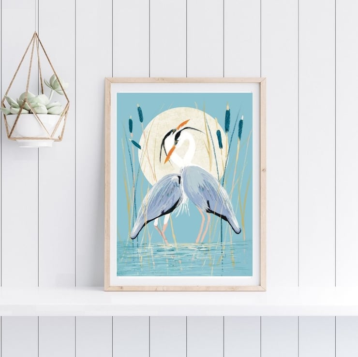 My new herons are together in the moonlight. A great contempory print of two beautiful birds. A unique vibrant print that will look fabulous hanging in your home and would also make the perfect gift.