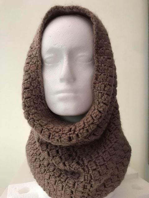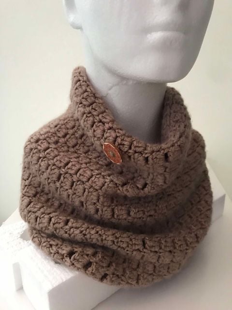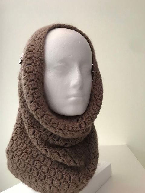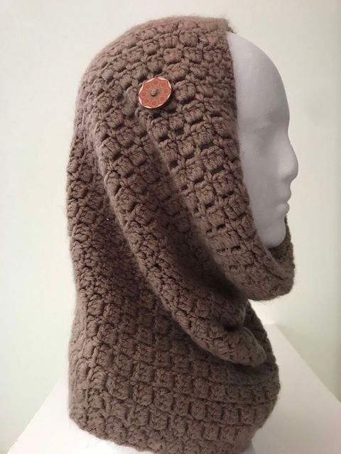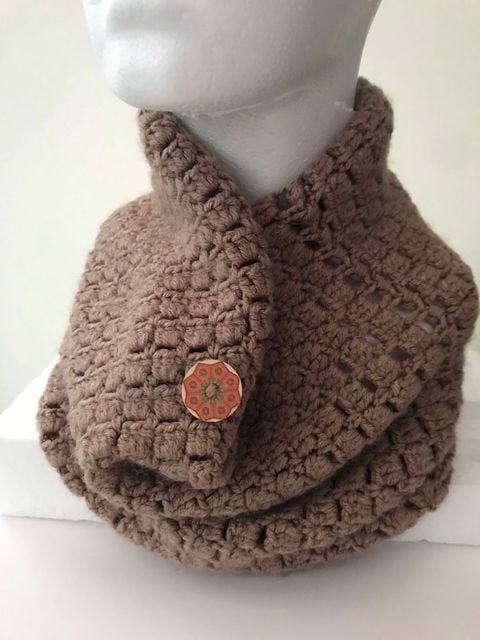 Crocheted neck warmer or headscarf, as you wish to wear it. Soft brown with one button as decoration. It is not removable.
