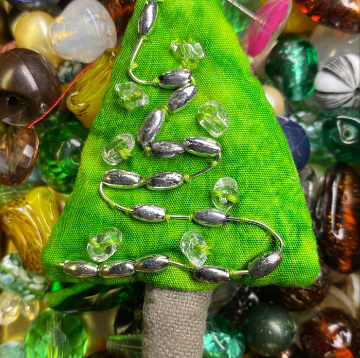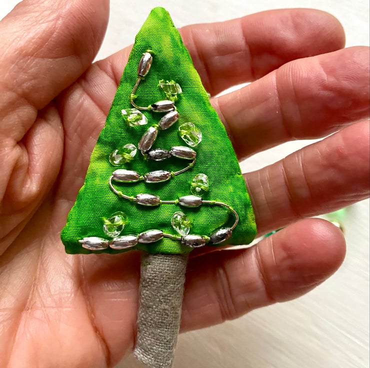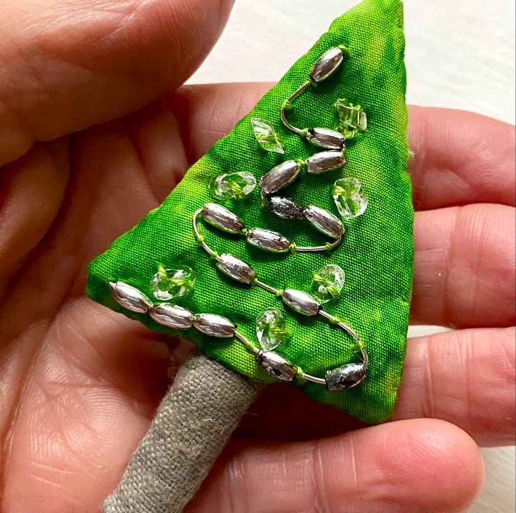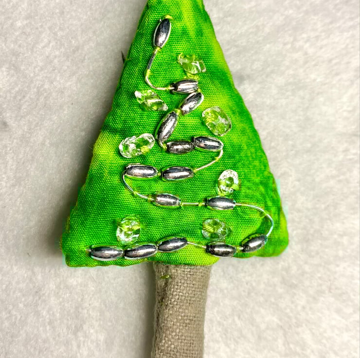 This festive Christmas tree brooch is embellished with silver beads and thread. Its trunk is made of hessian.
