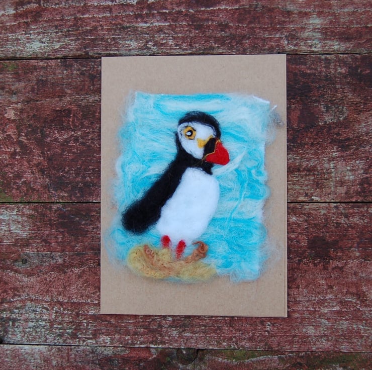 Birthday Card - Puffin, Needle felt card, wool card, wool painting, textile art