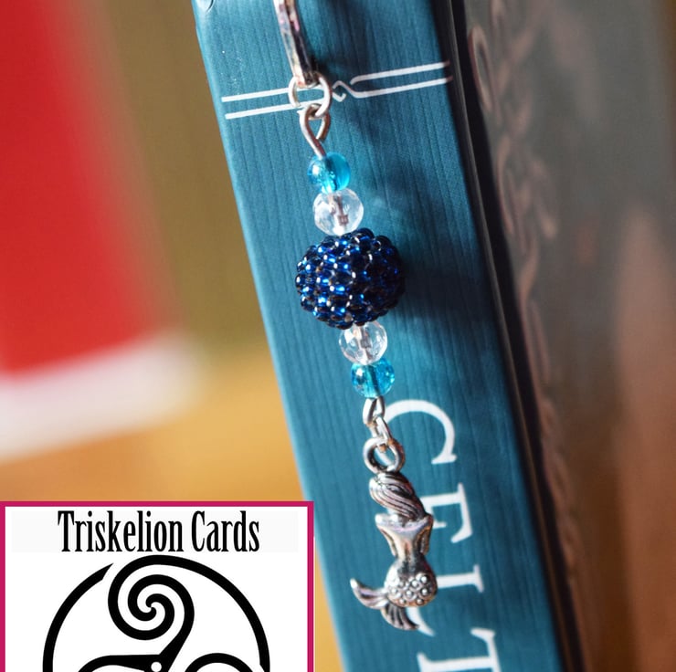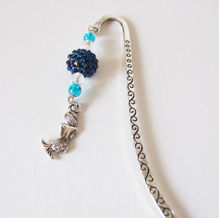 Shepherd's hook embossed metal bookmark with Tibetan silver mermaid charm, navy blue beaded bead, and turquoise round glass beads and transparent faceted round glass beads.