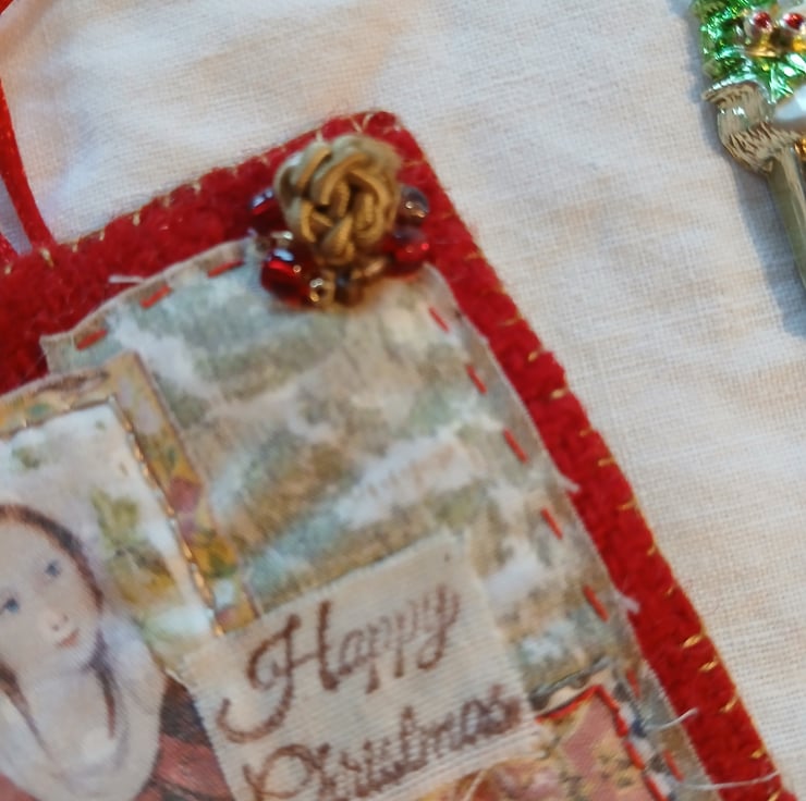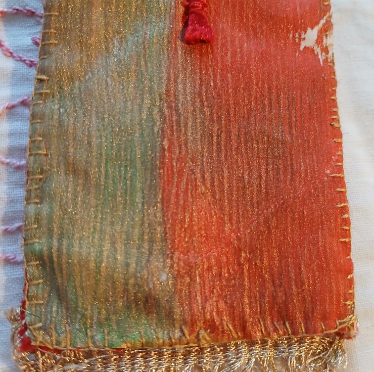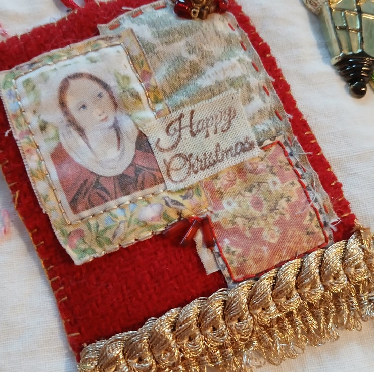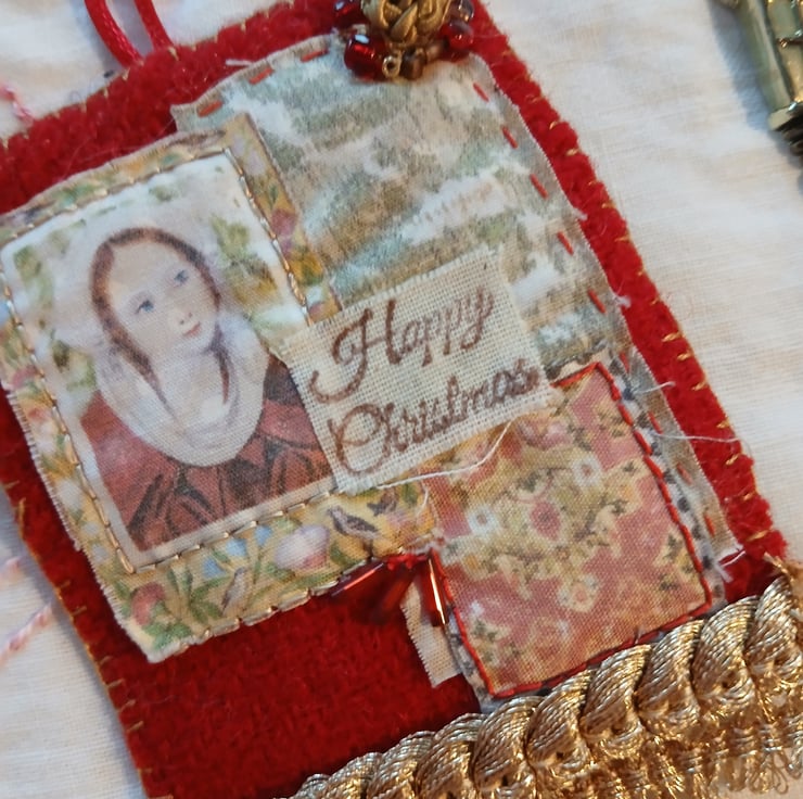 and collaged printed fabrics and decorated with gold metal braid and beads.