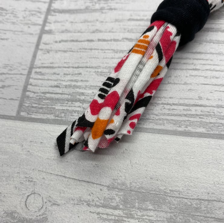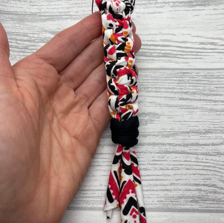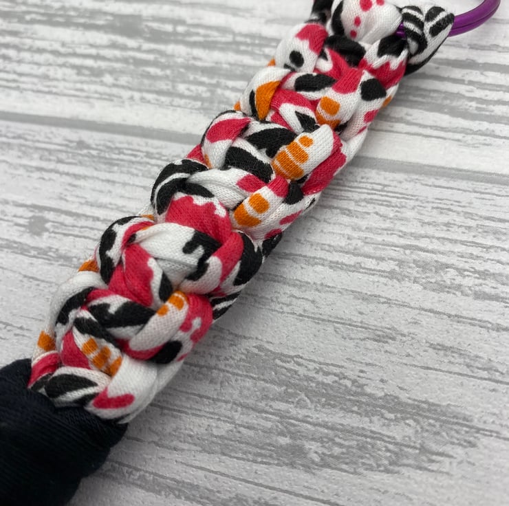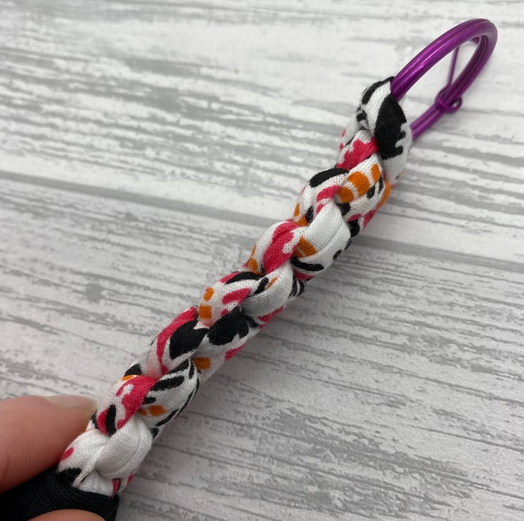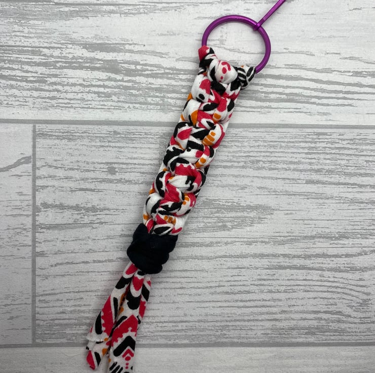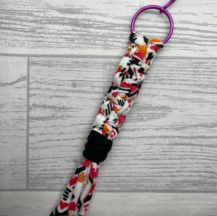 I’ve knotted this macrame keyring in recycled t-shirt yarn - this is cotton that is a waste product from the fashion industry that has been made into a thick yarn. I the main cotton is white with a print in black, pink and orange. The knots are secured with a black wrap, and set on a pink metal split ring and clasp. I’ve cut the tails diagonally so the ends curl up.