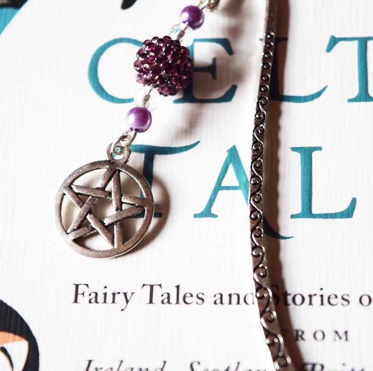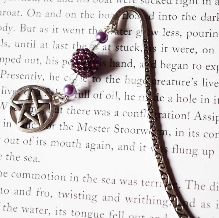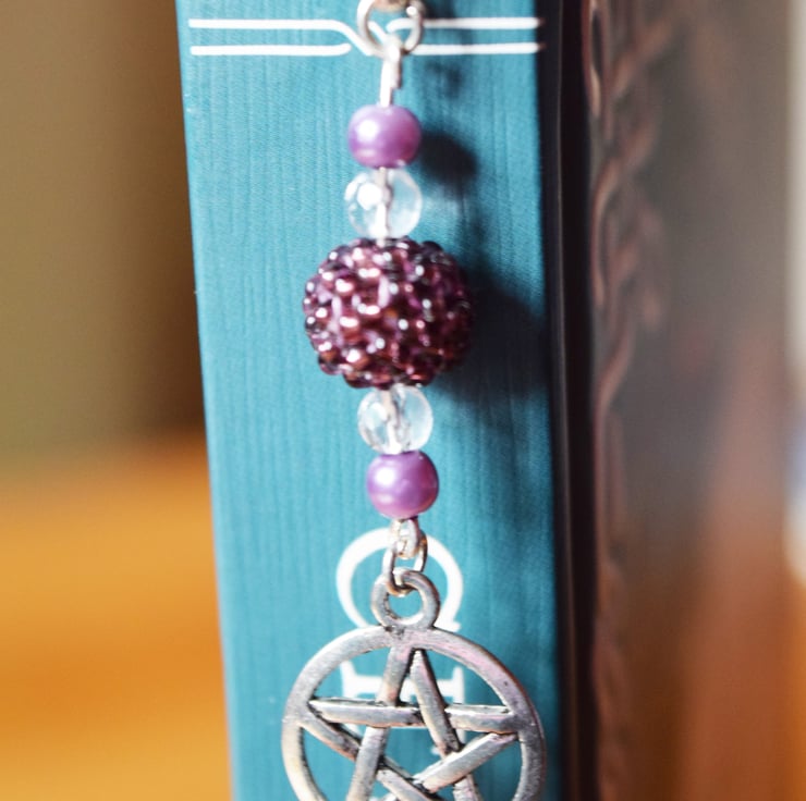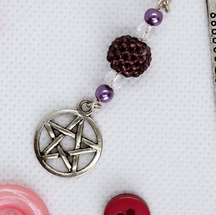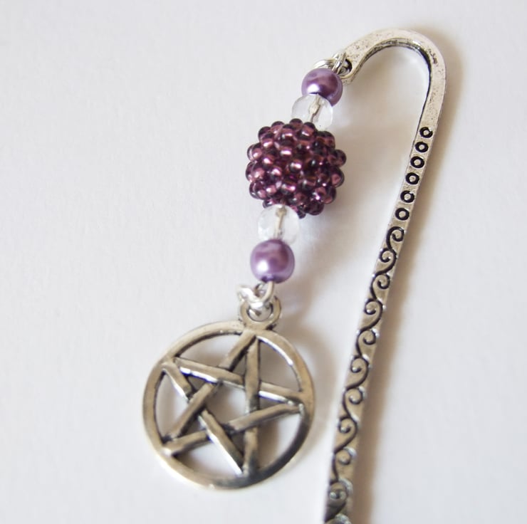 Shepherd's hook embossed metal bookmark with Tibetan silver pentagram charm, purple beaded bead, lilac pearl beads, transparent round faceted glass beads.